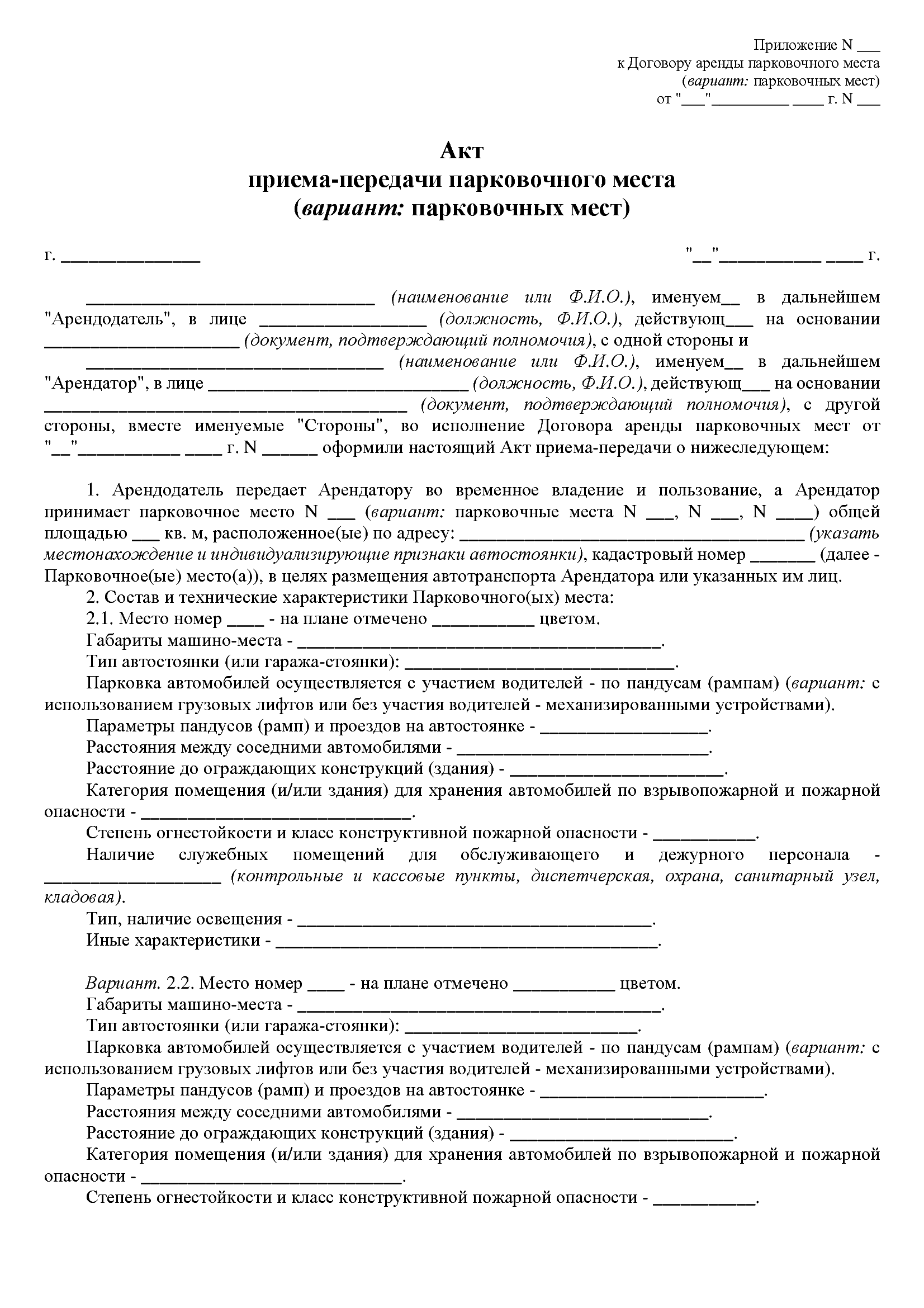 Ниже размещена типовая форма акта приёма-передачи парковочного места, которая используется как приложение к договору аренды.