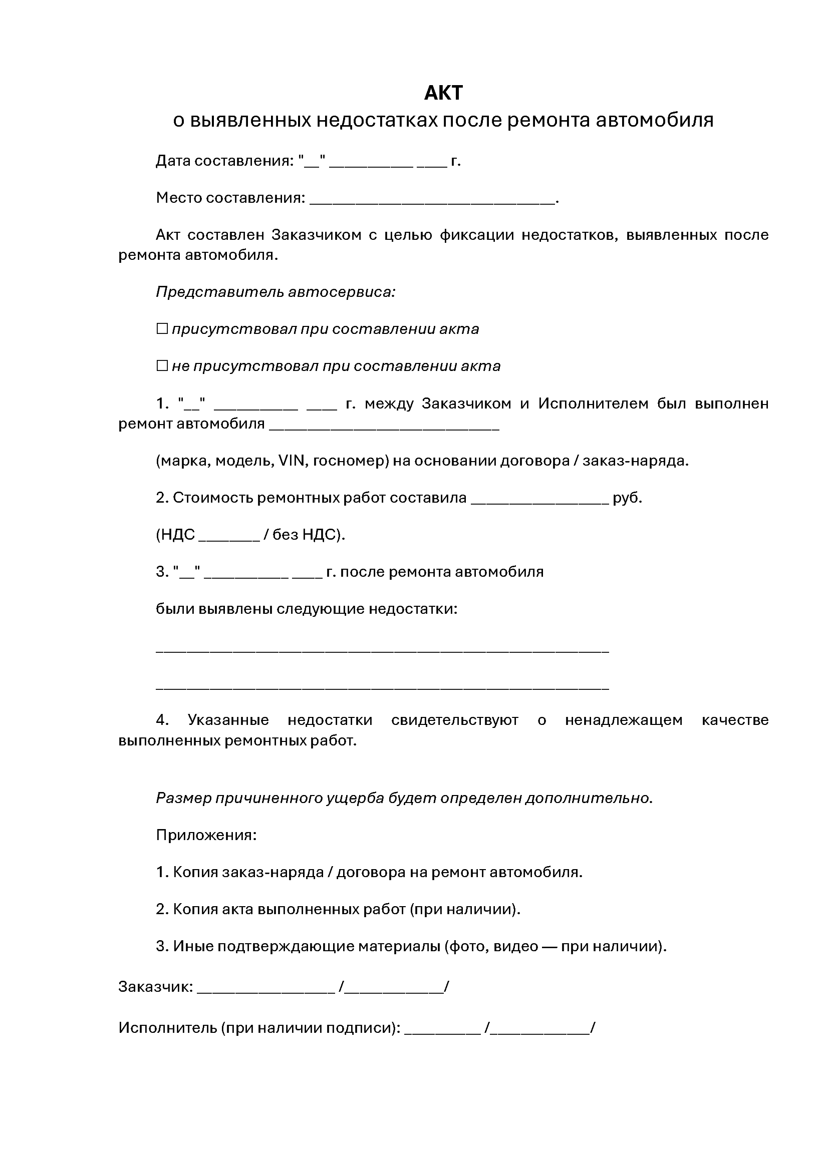Акт выявленных недостатков составляется после завершения ремонта автомобиля, если в процессе эксплуатации или осмотра выявлены дефекты, которые отсутствовали до ремонта либо не были устранены автосервисом.