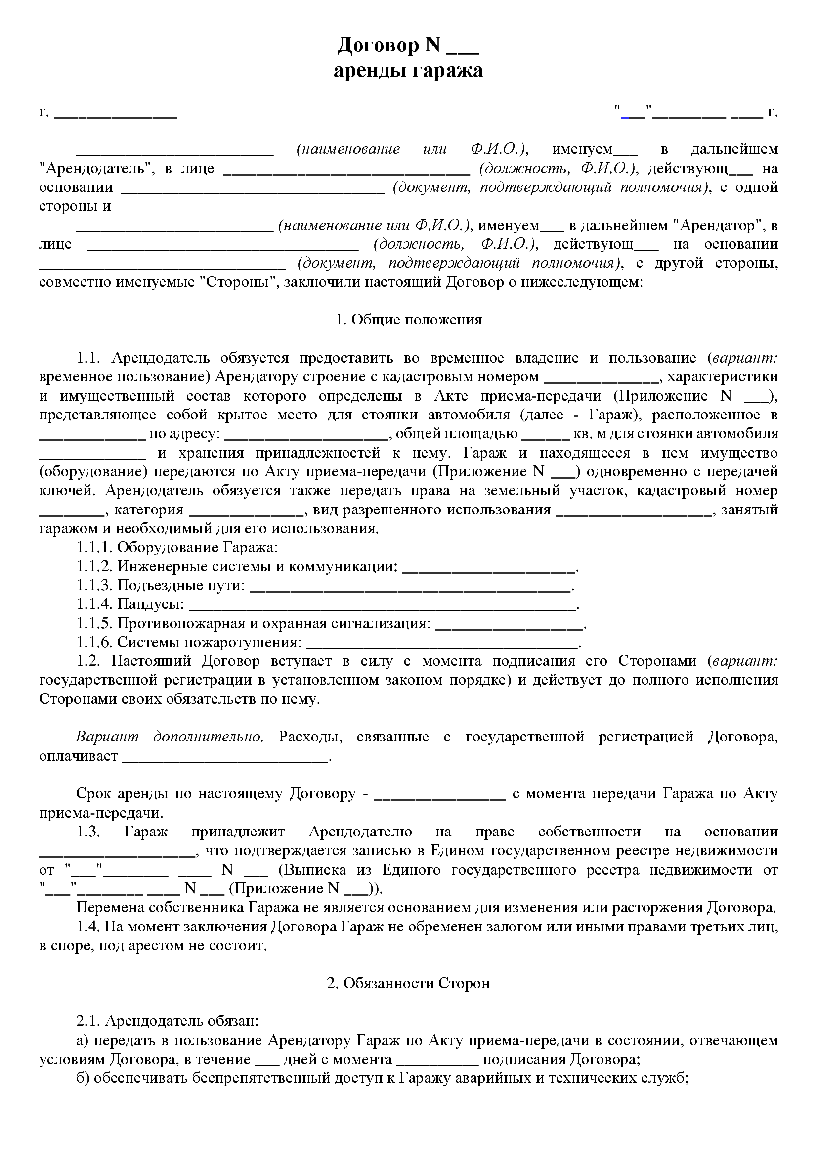 Договор аренды гаража является гражданско-правовым договором, по которому арендодатель предоставляет арендатору гараж за плату на определённый срок. Право собственности на гараж при этом сохраняется за арендодателем.