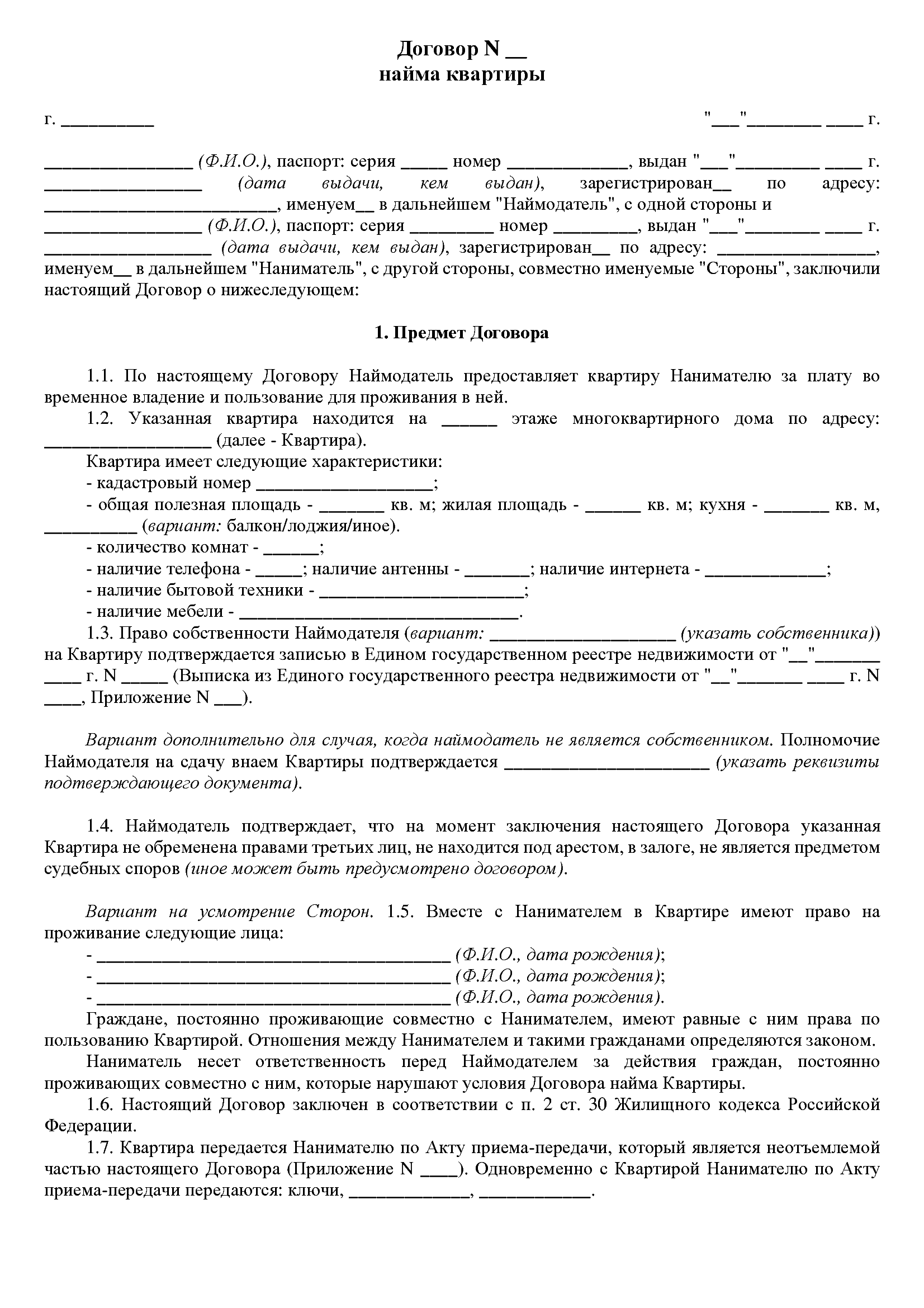 Бланк договора найма квартиры содержит все ключевые условия, необходимые для оформления отношений между наймодателем и нанимателем, в том числе: