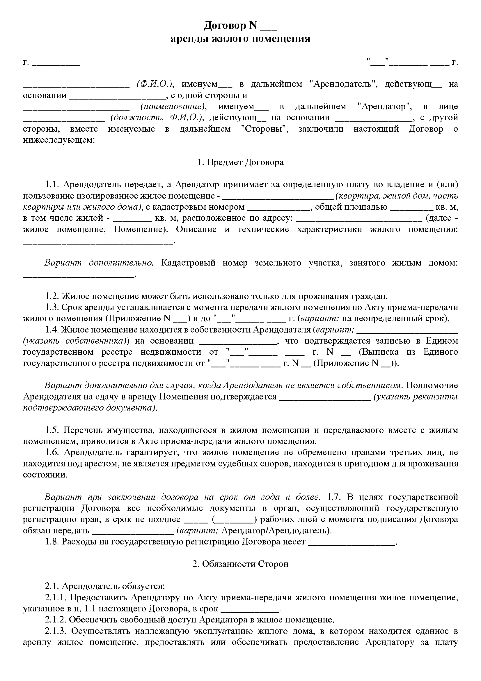 Бланк договора аренды жилого помещения с юридическим лицом содержит все существенные условия, необходимые для оформления арендных отношений, включая: