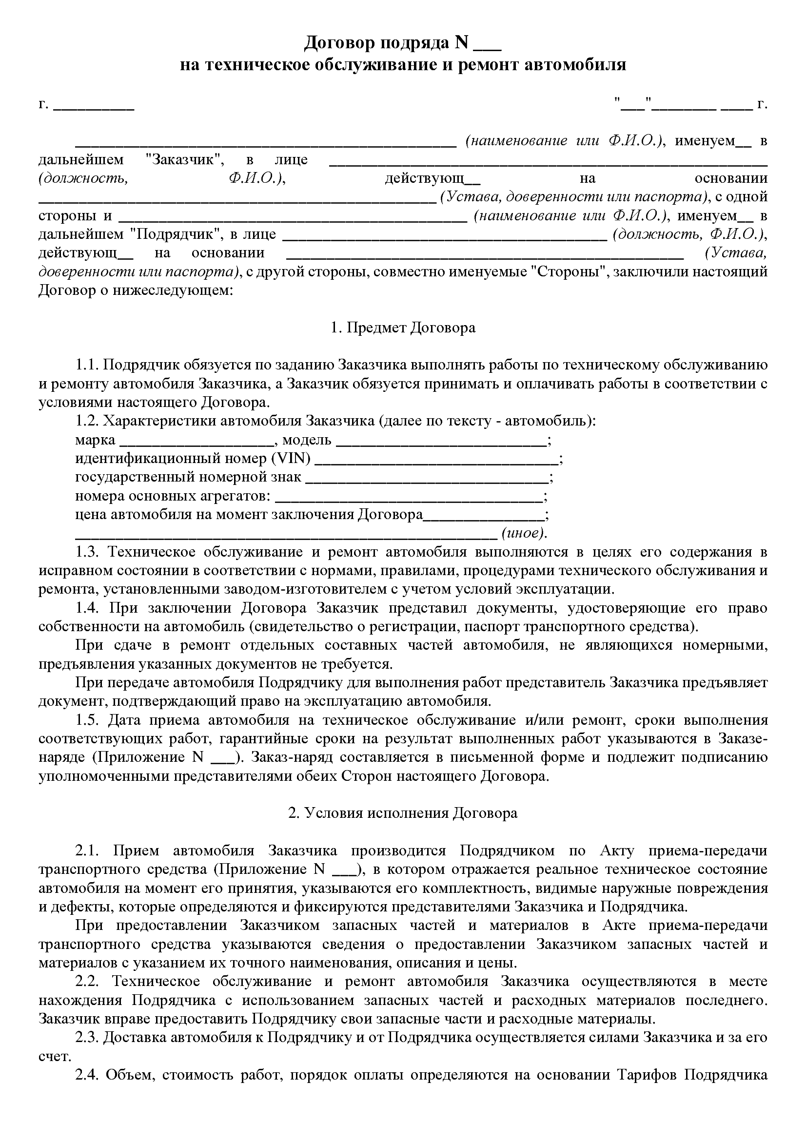 Предметом договора является выполнение ремонтных работ по автомобилю заказчика. Конкретный перечень работ, их стоимость и сроки выполнения, как правило, указываются в заказ-наряде, который оформляется в рамках договора.