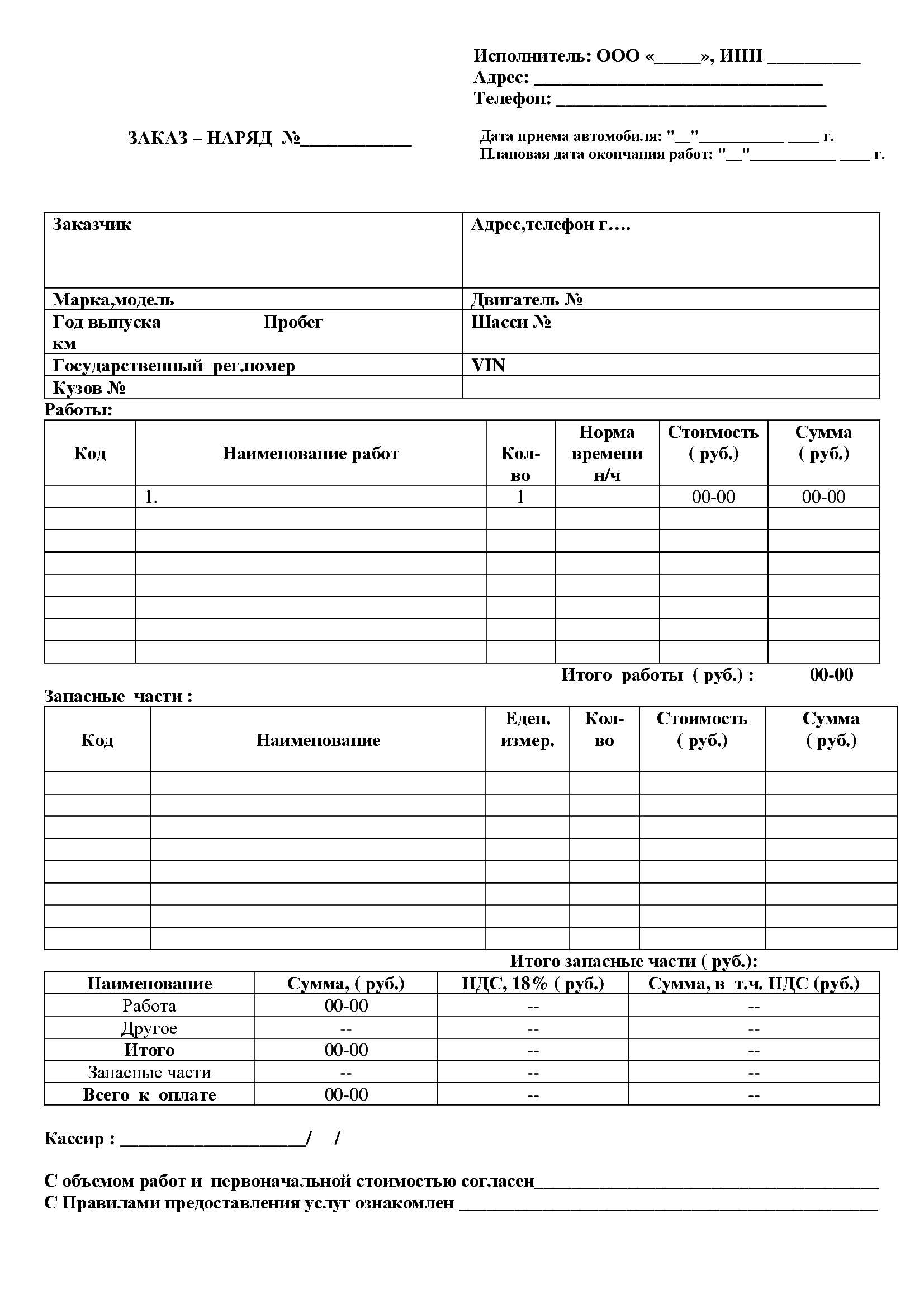 Основной заказ-наряд на ремонт автомобиля — образец и бланк