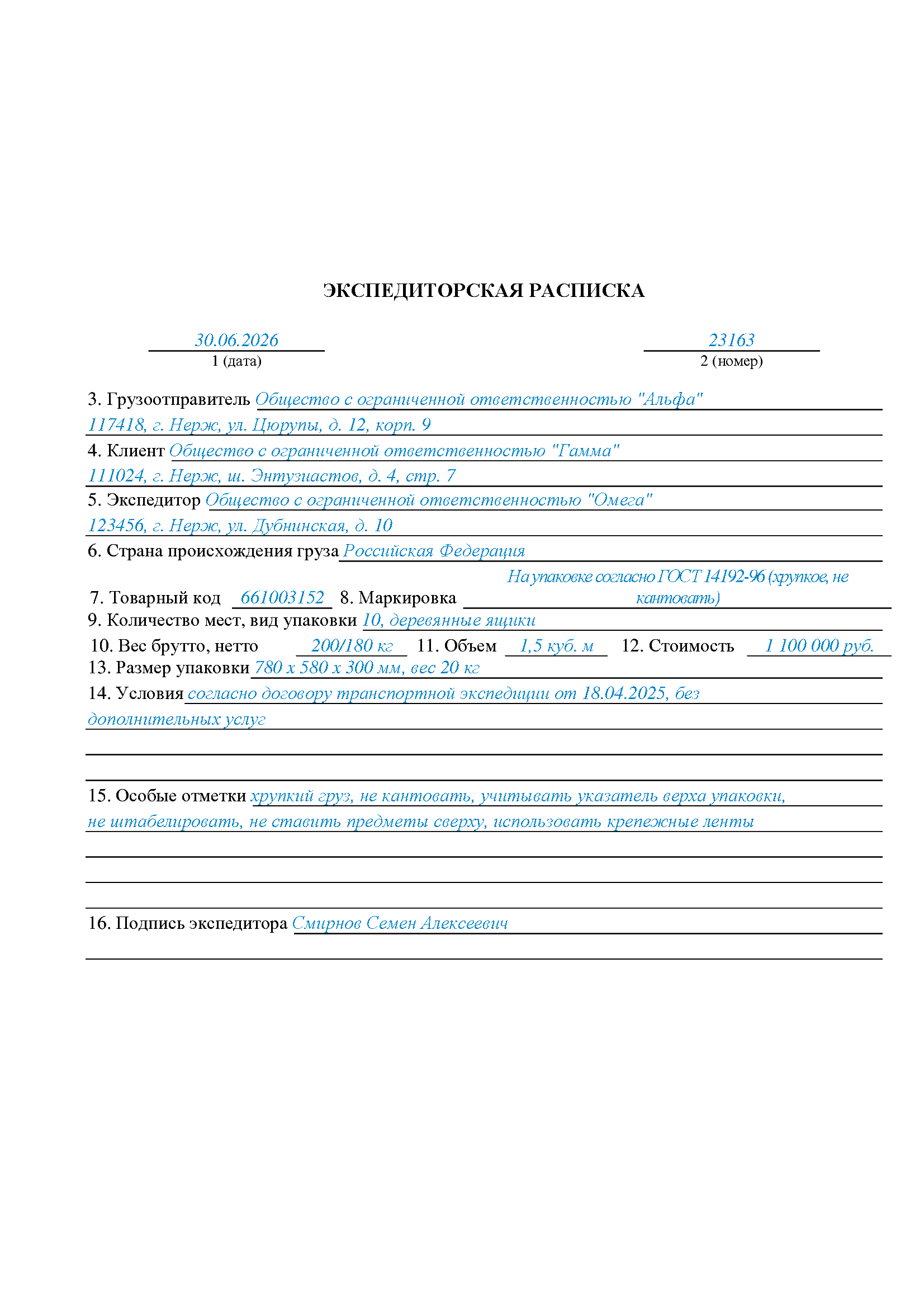Экспедиторская расписка — это письменный документ, которым подтверждается факт принятия груза экспедитором от клиента для организации перевозки. Такая расписка используется в сфере транспортно-экспедиционных услуг и служит доказательством передачи груза экспедитору.