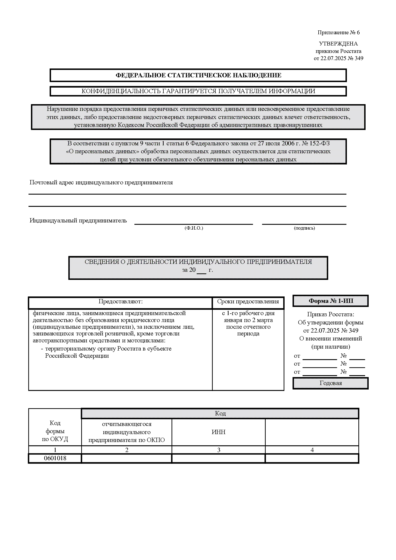 Форма 1-ИП. Сведения о деятельности индивидуального предпринимателя (ред 22.07.2025 N 349)