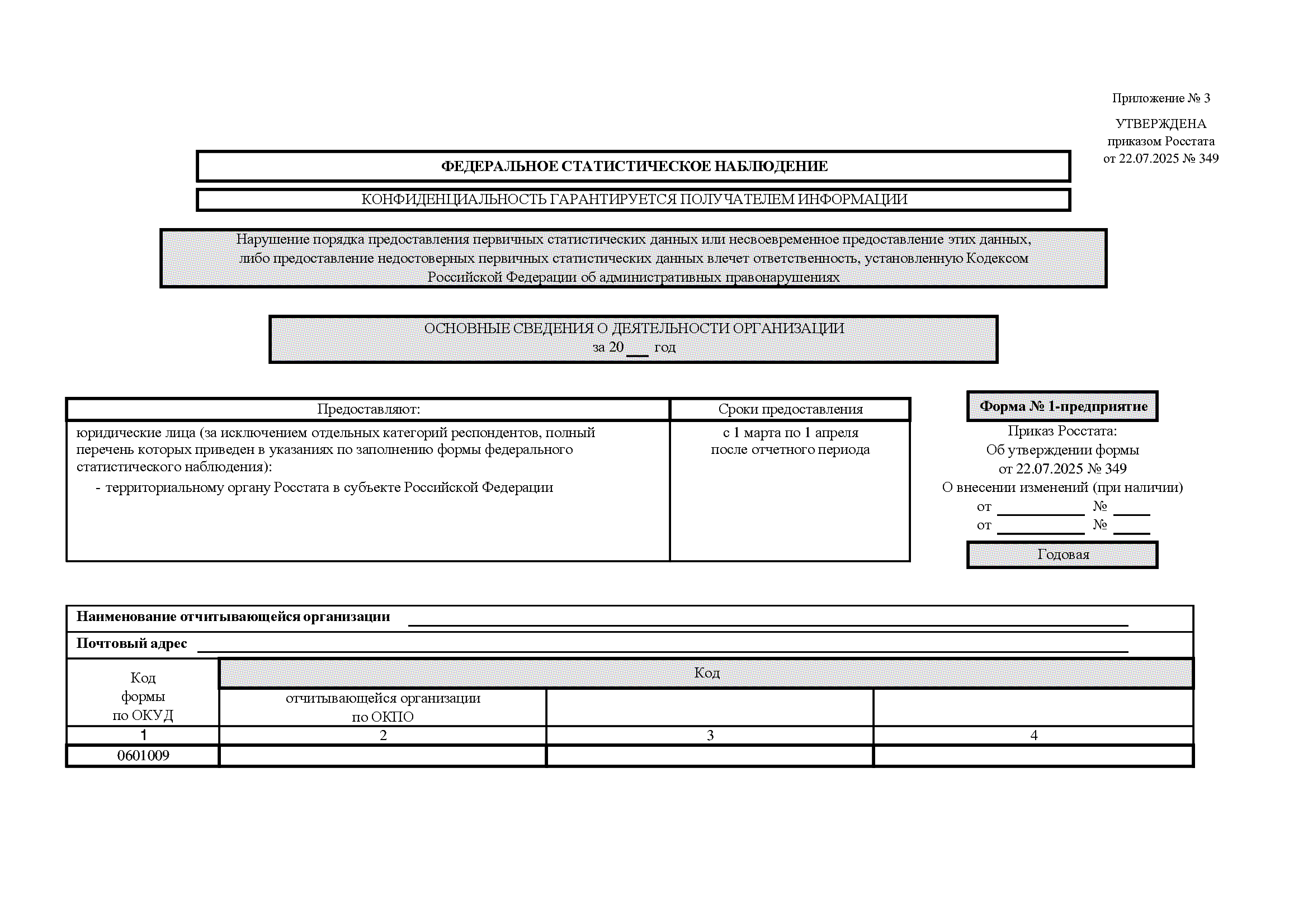 Форма 1-предприятие. Основные сведения о деятельности организации от 22.07.2025 N 349