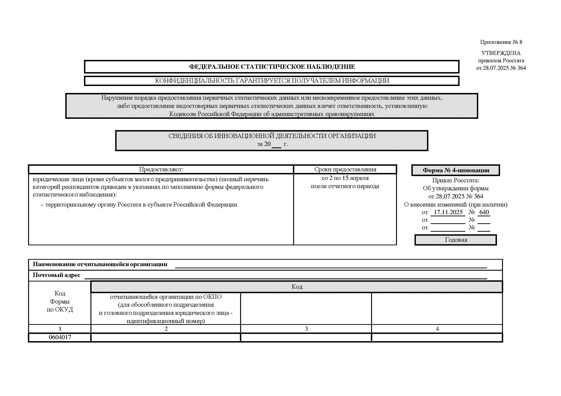 Форма № 4-инновация — это официальный бланк федерального статистического наблюдения, применяемый для сбора сведений об инновационной деятельности организаций. Форма утверждена приказом Росстата от 28.07.2025 № 364 (в редакции приказа от 17.11.2025 № 640) и применяется начиная с отчетности за 2025 год.