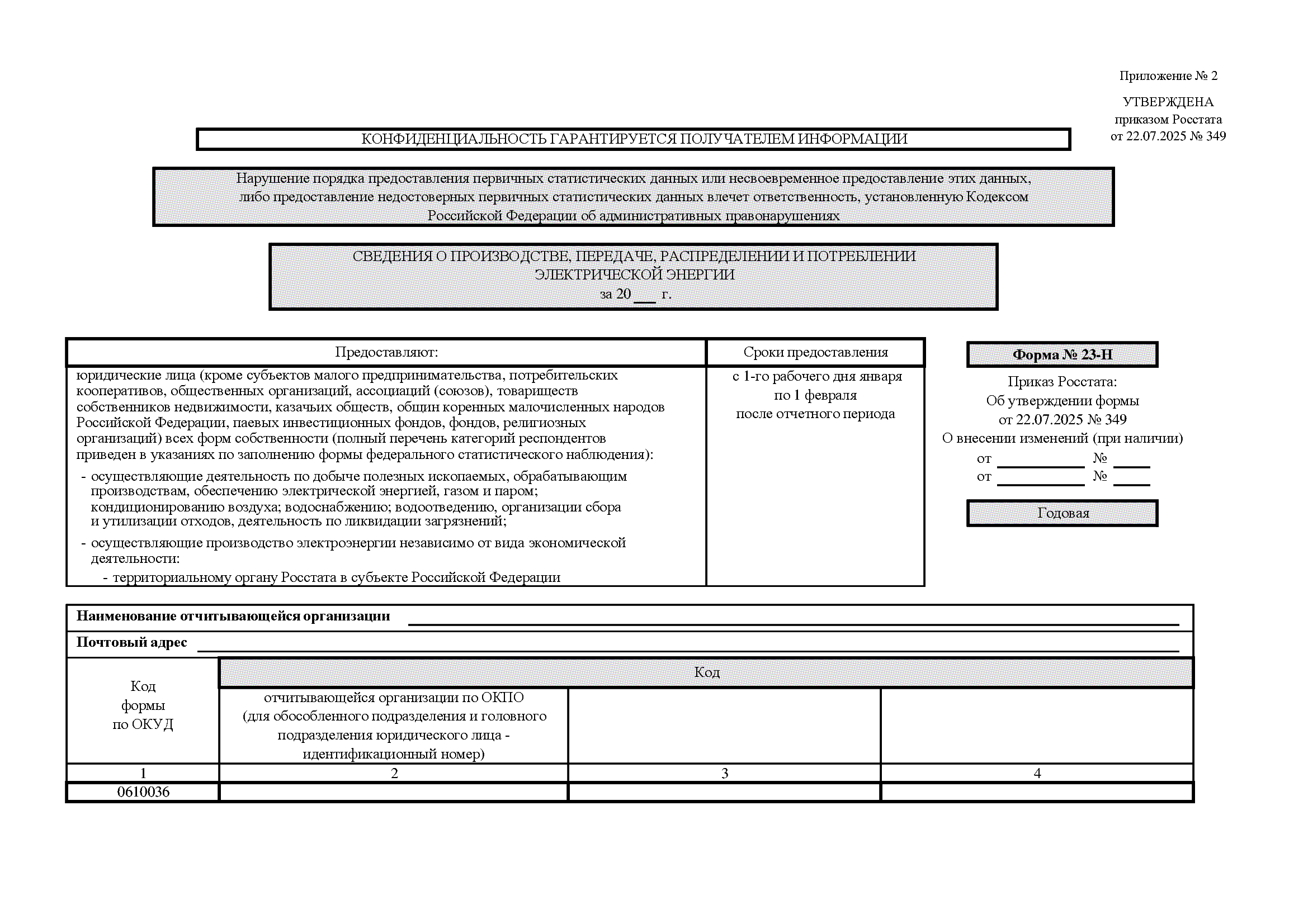 Форма N 23-Н утверждена Приказом Росстата от 22.07.2025 № 349 (Приложение № 2) и применяется для сбора официальных статистических данных об объемах производства, передачи, распределения и потребления электрической энергии. Сбор данных по форме осуществляется начиная с отчетного периода за 2025 год.