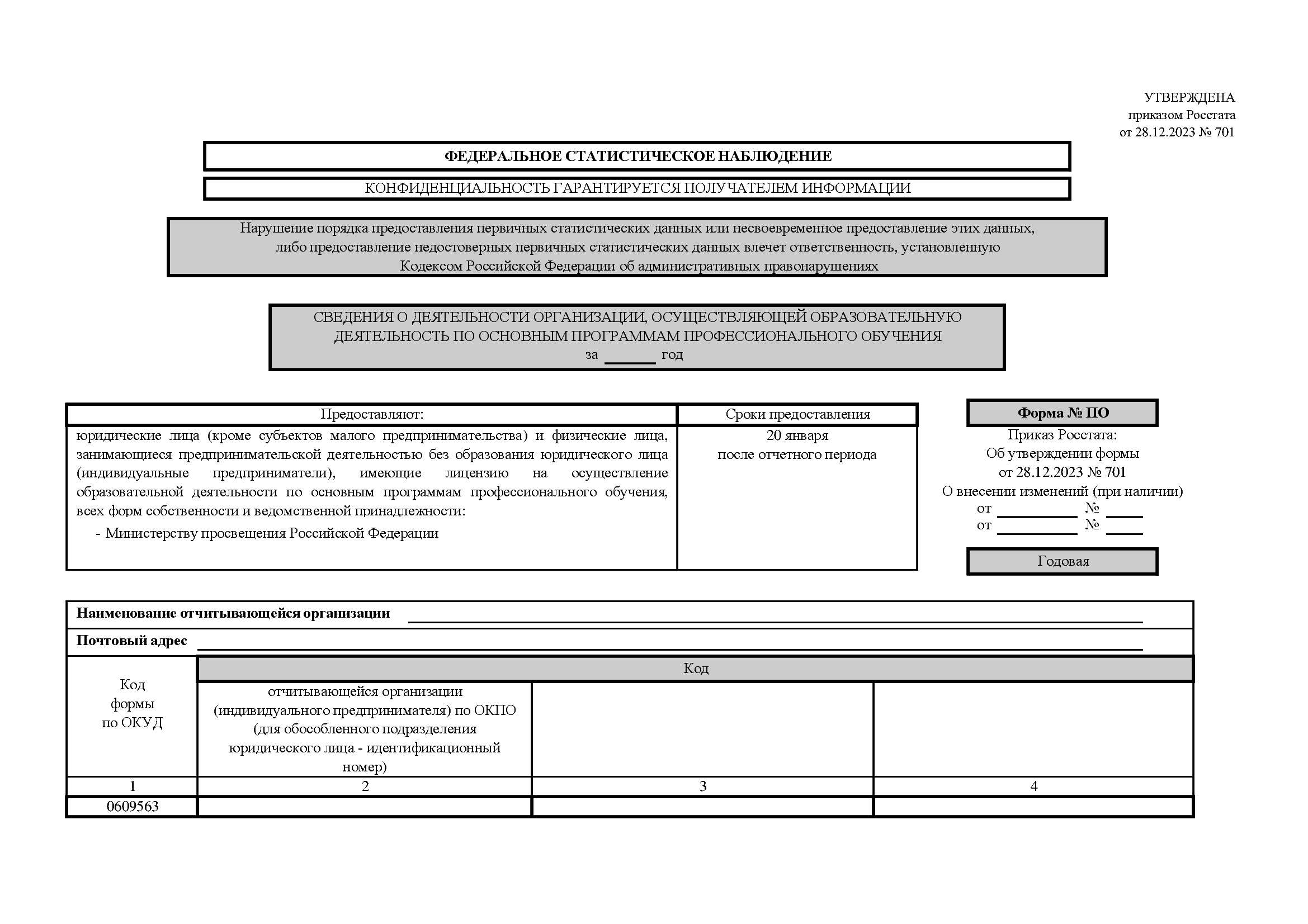 Форма ПО. Сведения о деятельности организации, осуществляющей образовательную деятельность по основным программам профессионального обучения от 28.12.2023 N 701
