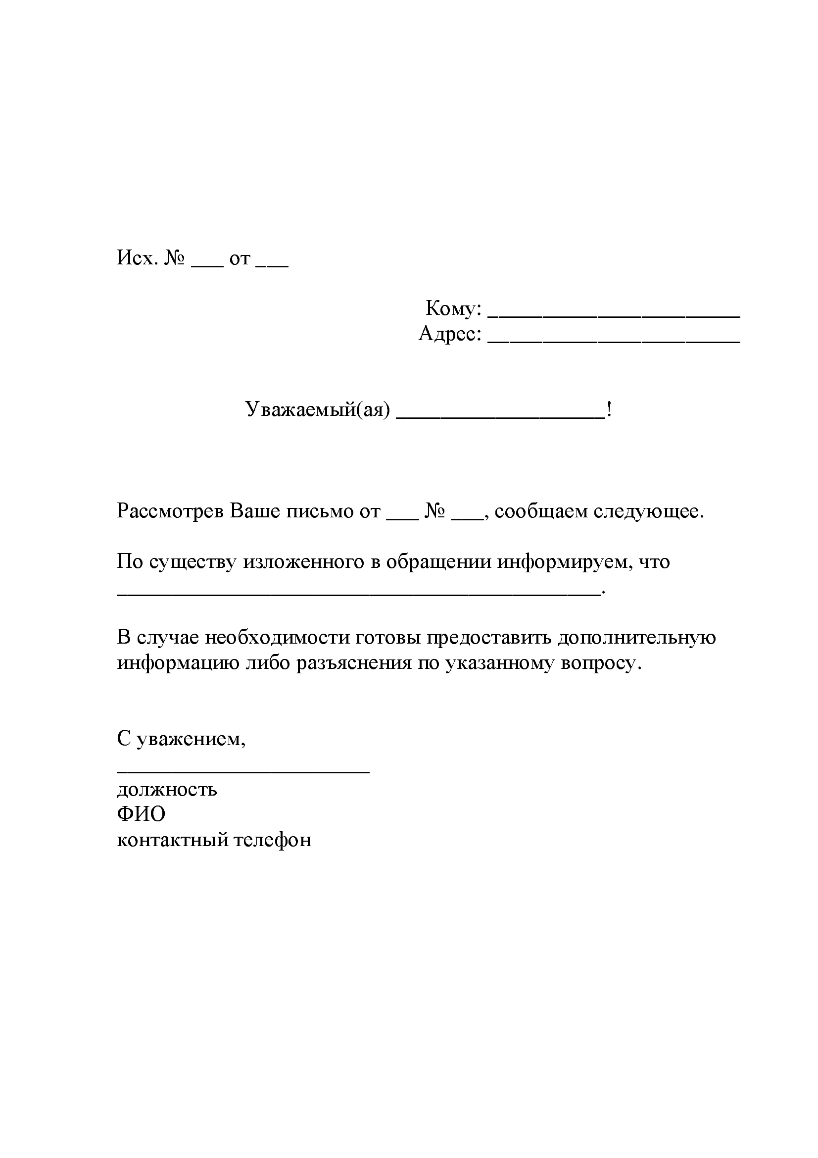 В письме-ответе указываются сведения об отправителе и адресате, а также излагается позиция по существу полученного обращения. При необходимости может быть указано основание принятого решения.