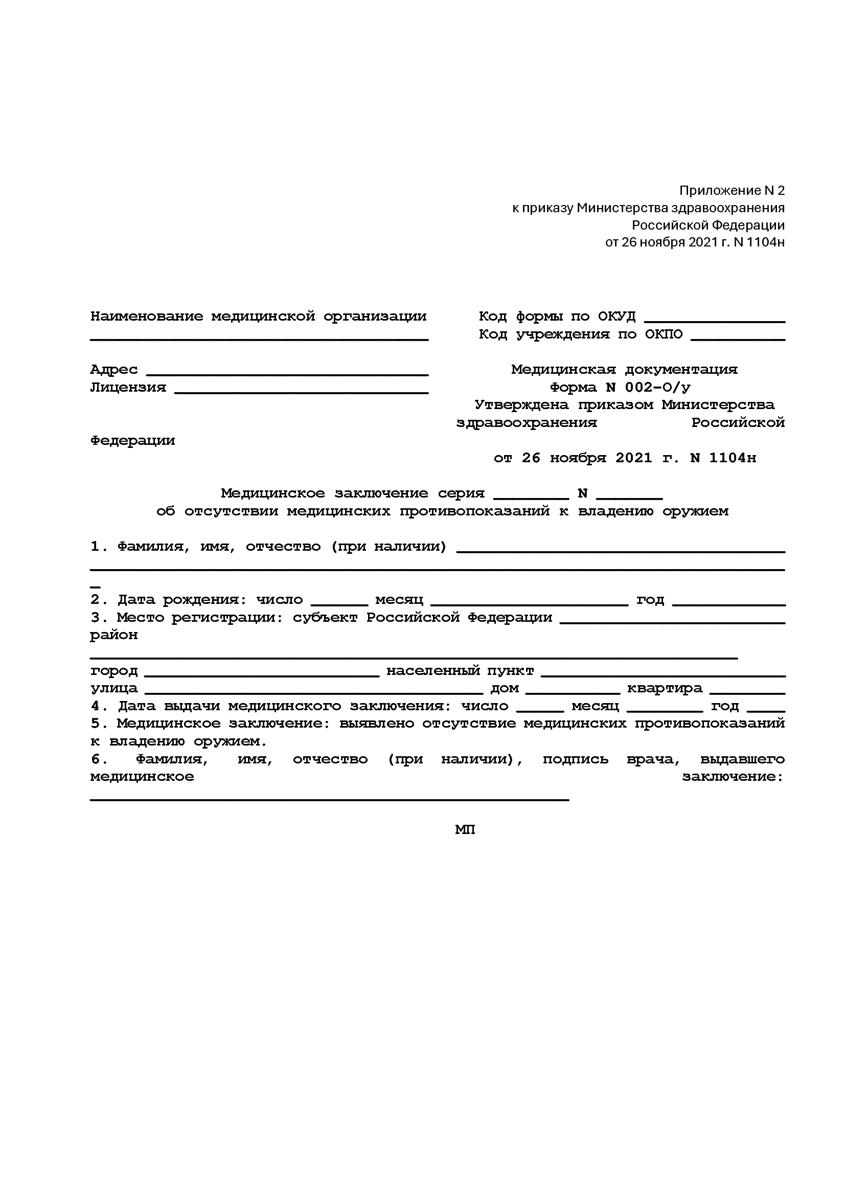Форма медицинского заключения 002-О/у утверждена приказом Министерства здравоохранения Российской Федерации и применяется на всей территории Российской Федерации. Документ оформляется по результатам медицинского освидетельствования на наличие медицинских противопоказаний к владению оружием.