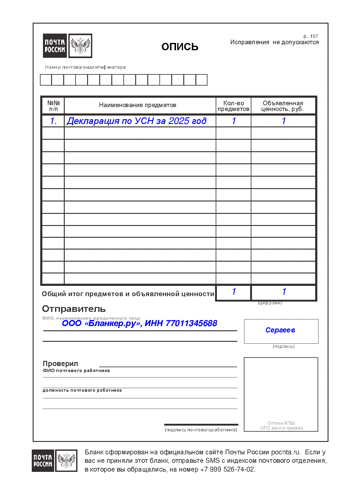 Отправитель перед запечатыванием заполняет два бланка описи вложения со следующими данными: