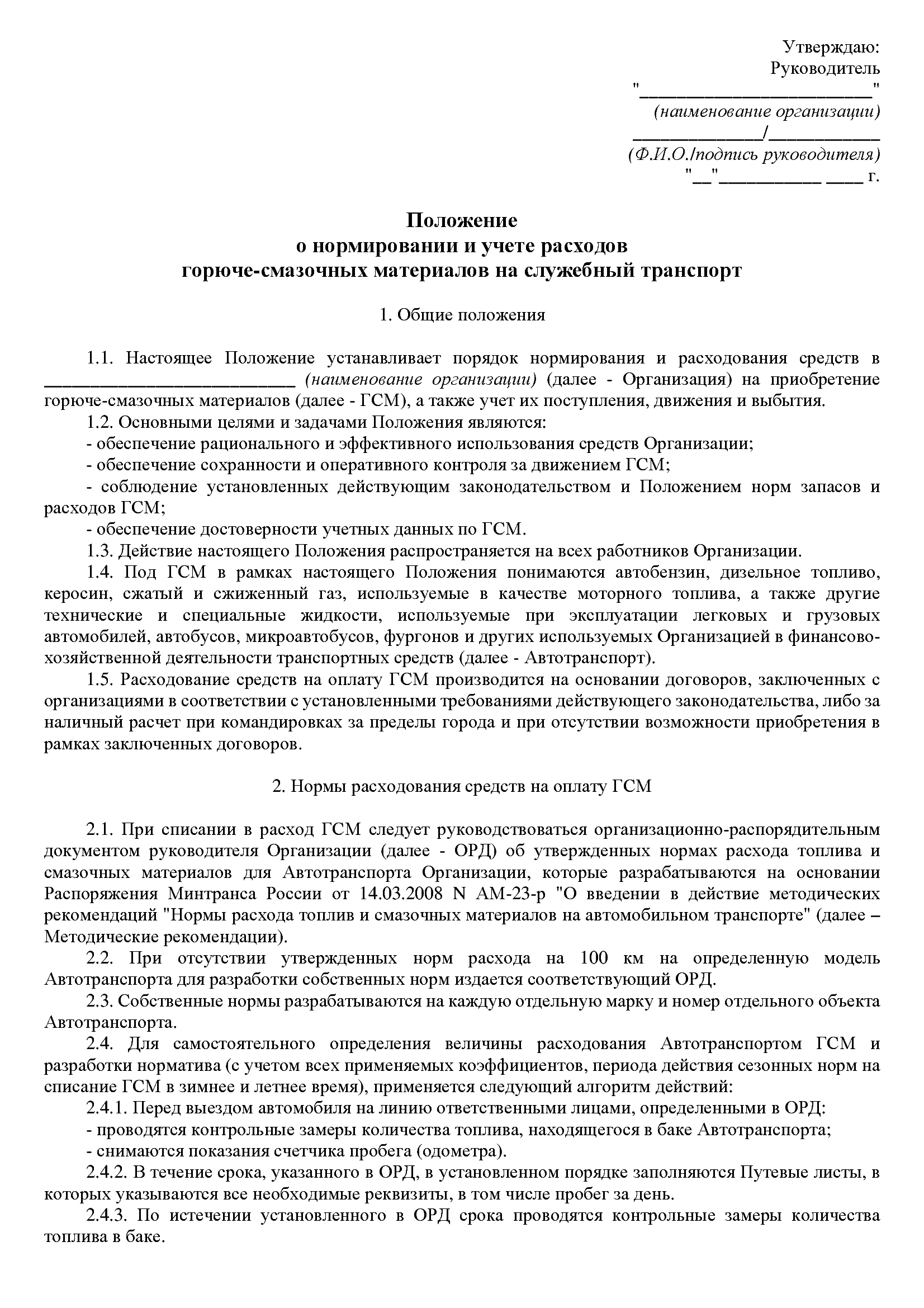 Положение разрабатывается и утверждается в организации при наличии собственного или арендованного автотранспорта, а также при использовании топлива и ГСМ в производственной деятельности.