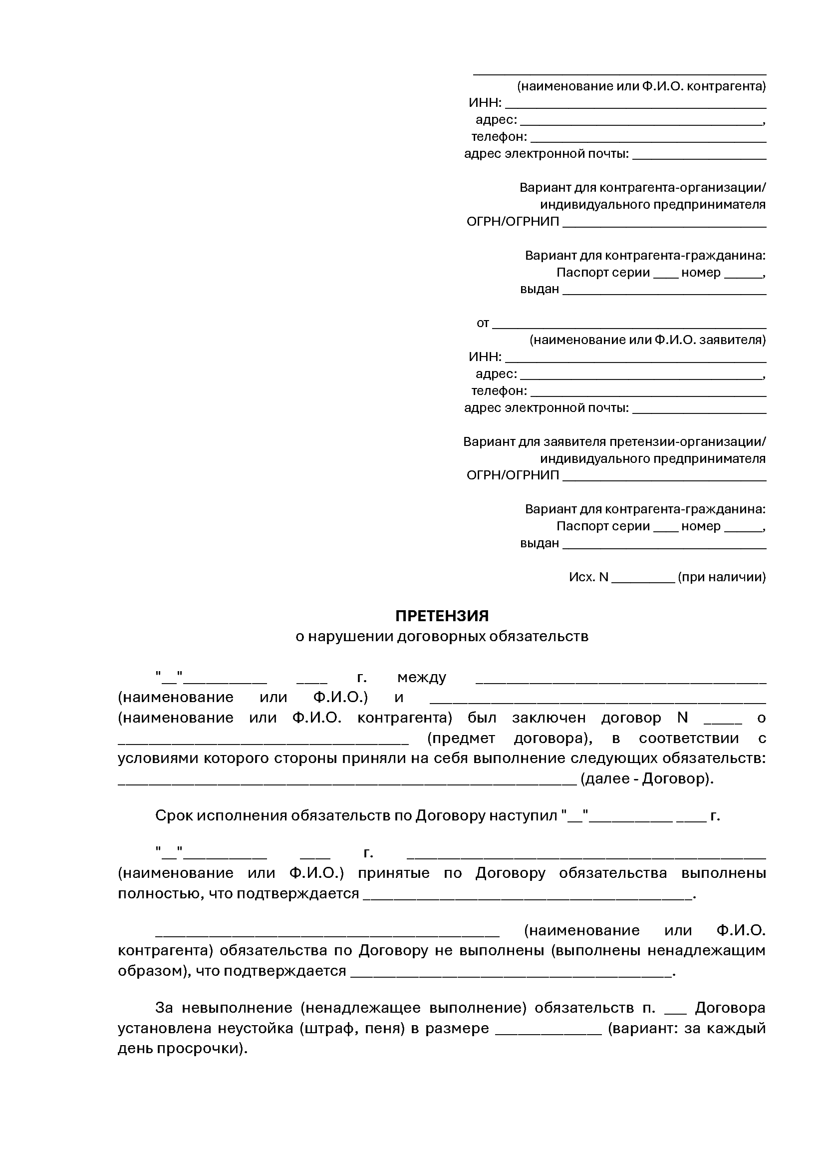 Претензия по договору — это письменный документ, содержащий обращение одной стороны договорных отношений к другой в связи с нарушением обязательств, предусмотренных договором. Претензия используется как инструмент досудебного урегулирования споров и фиксирует позицию стороны, предъявляющей требования.