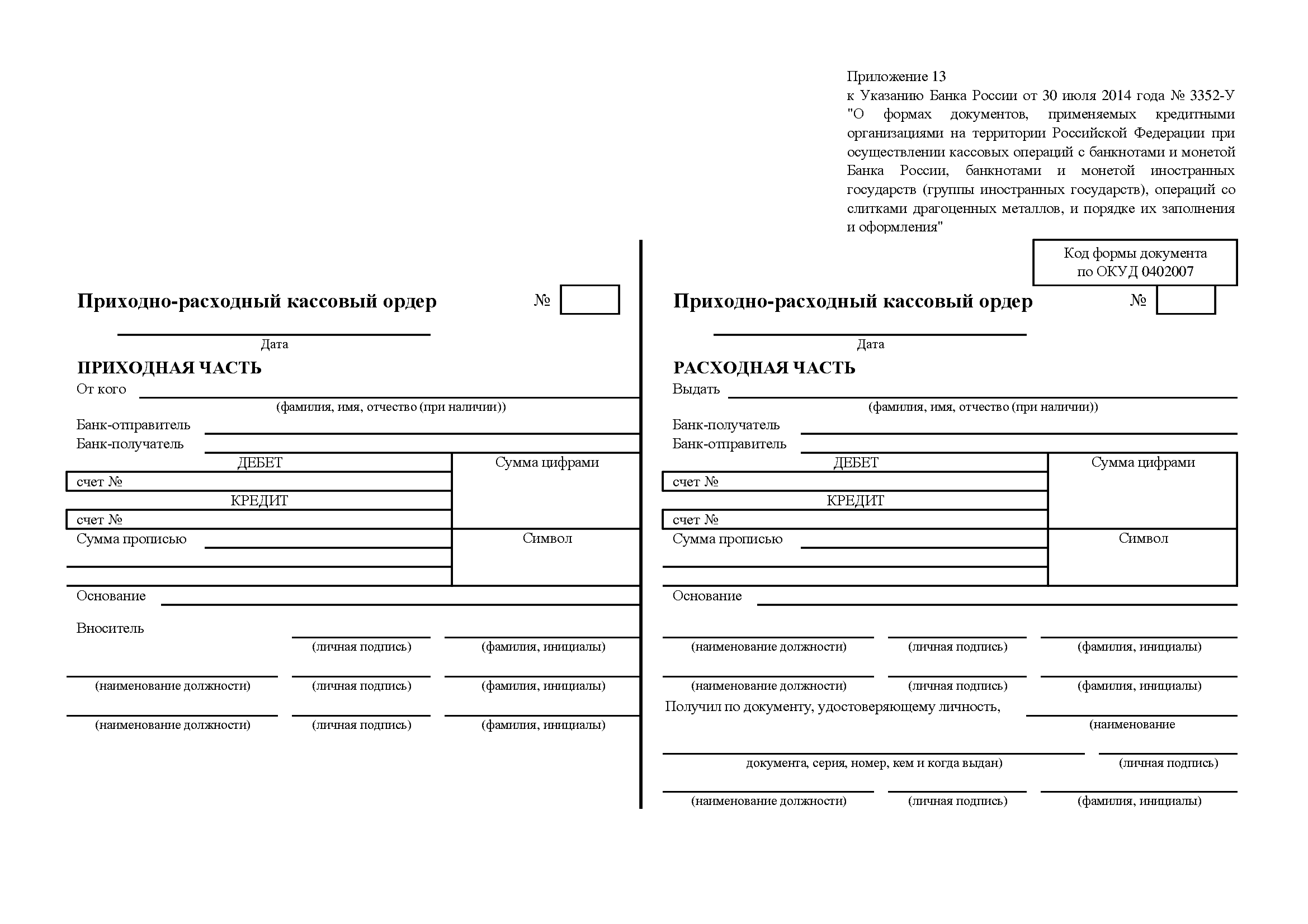 Официальное наименование документа — приходно-расходный кассовый ордер. Банком России для данного документа установлен код формы 0402007.