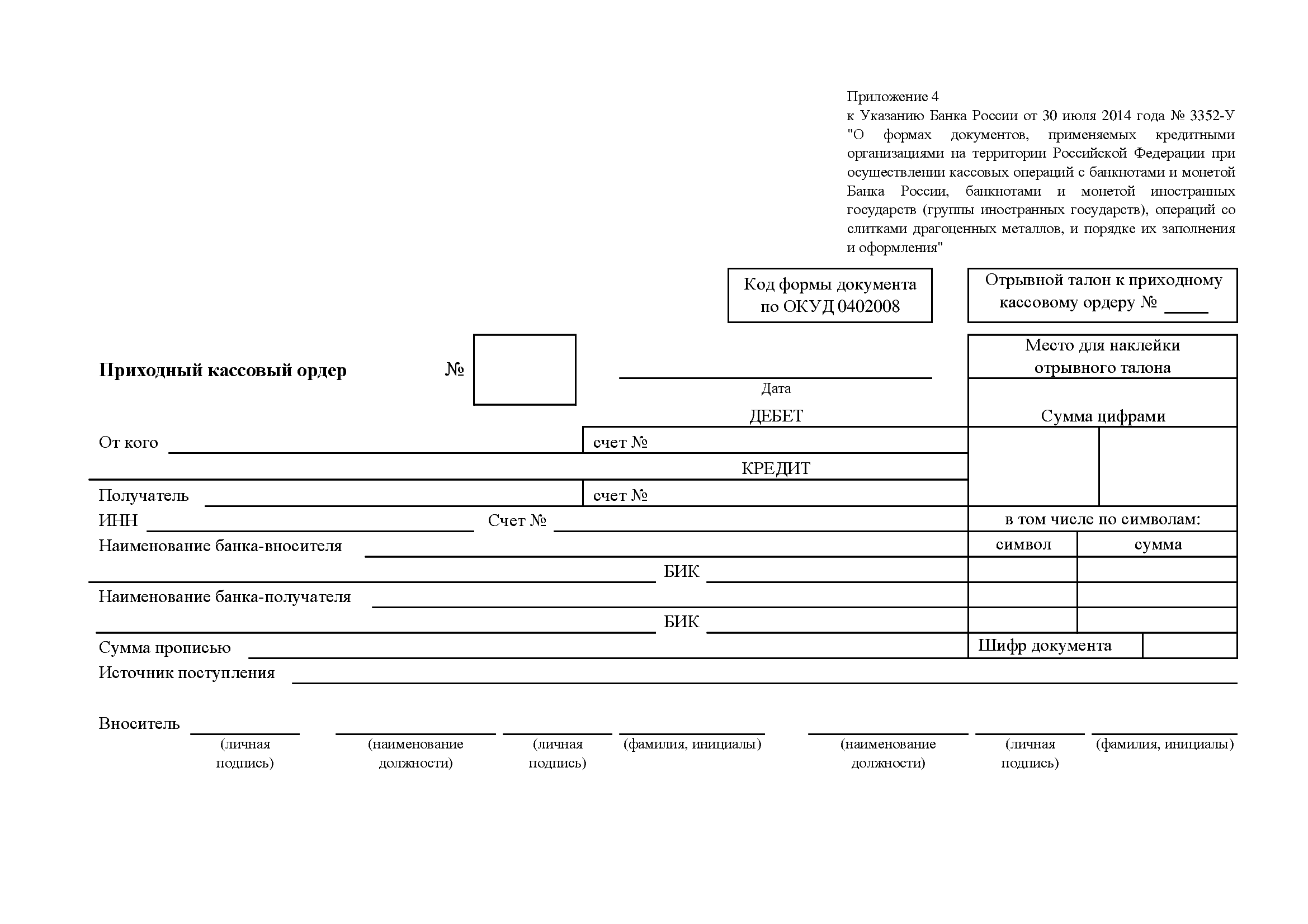 Официальное наименование документа — приходный кассовый ордер. Банком России для данного документа установлен код формы 0402008.