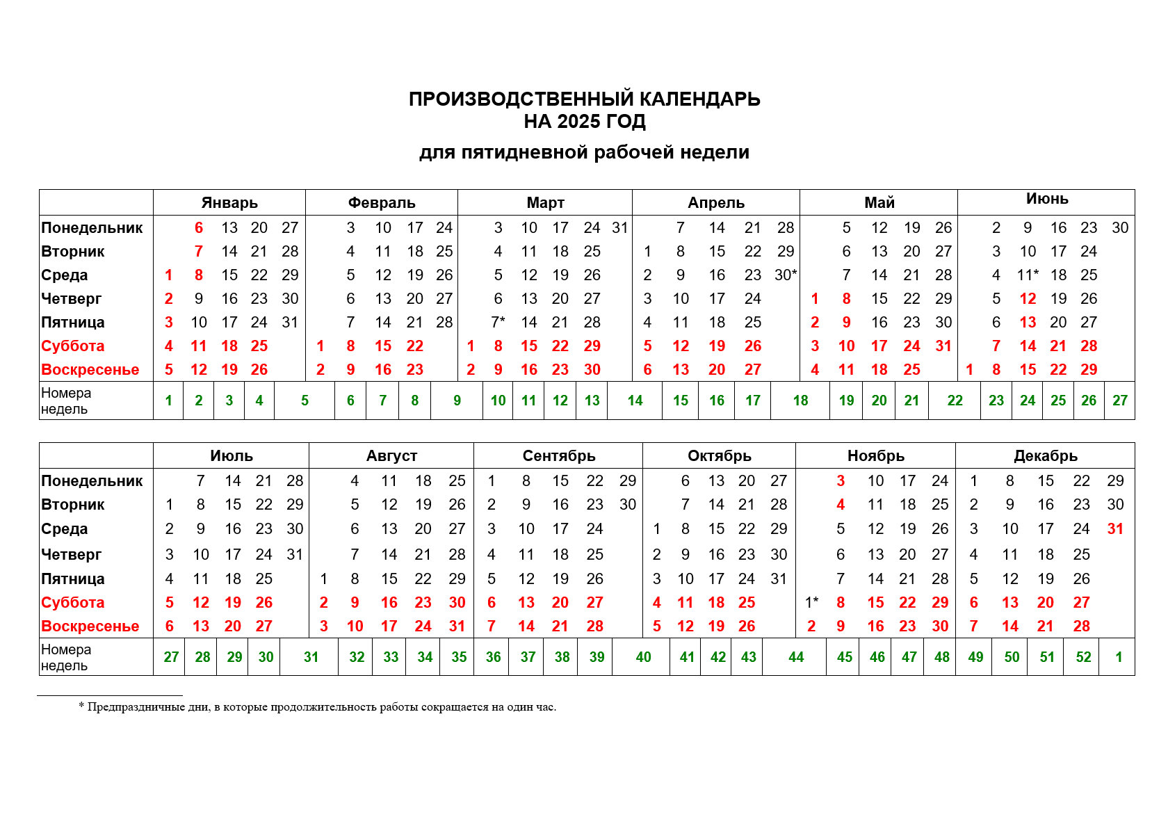В производственном календаре приводится норма рабочего времени на месяцы, кварталы и 2025 год в целом при 40-, 39-, 36-, 35-, 33-, 30-, 24-, 20-, 18- часовых рабочих неделях, а также количество рабочих и выходных дней при пятидневной рабочей неделе с двумя выходными днями.