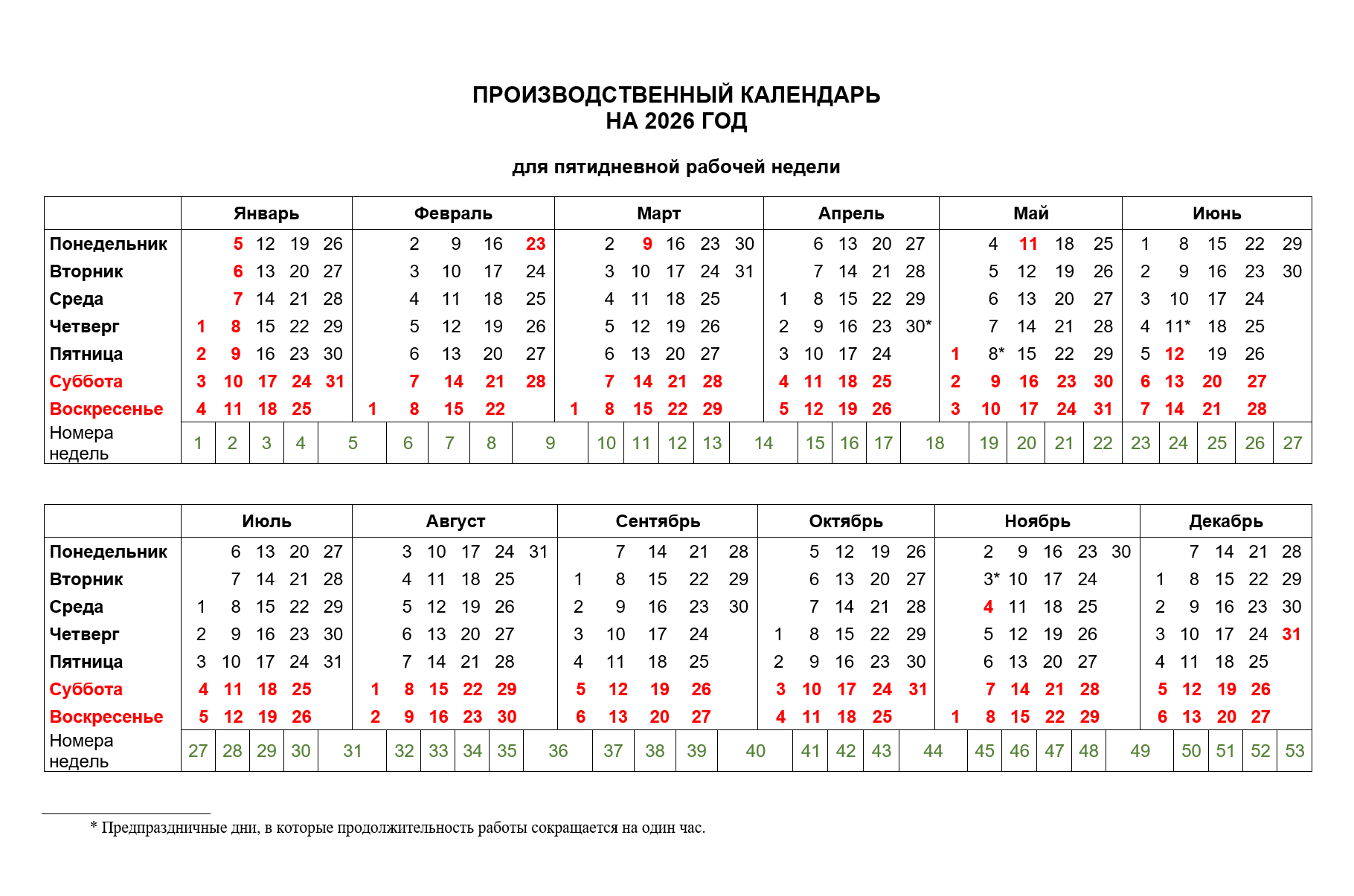 В производственном календаре приводится норма рабочего времени на месяцы, кварталы и 2026 год в целом при 40-, 39-, 36-, 35-, 33-, 30-, 24-, 20-, 18- часовых рабочих неделях, а также количество рабочих и выходных дней при пятидневной рабочей неделе с двумя выходными днями.