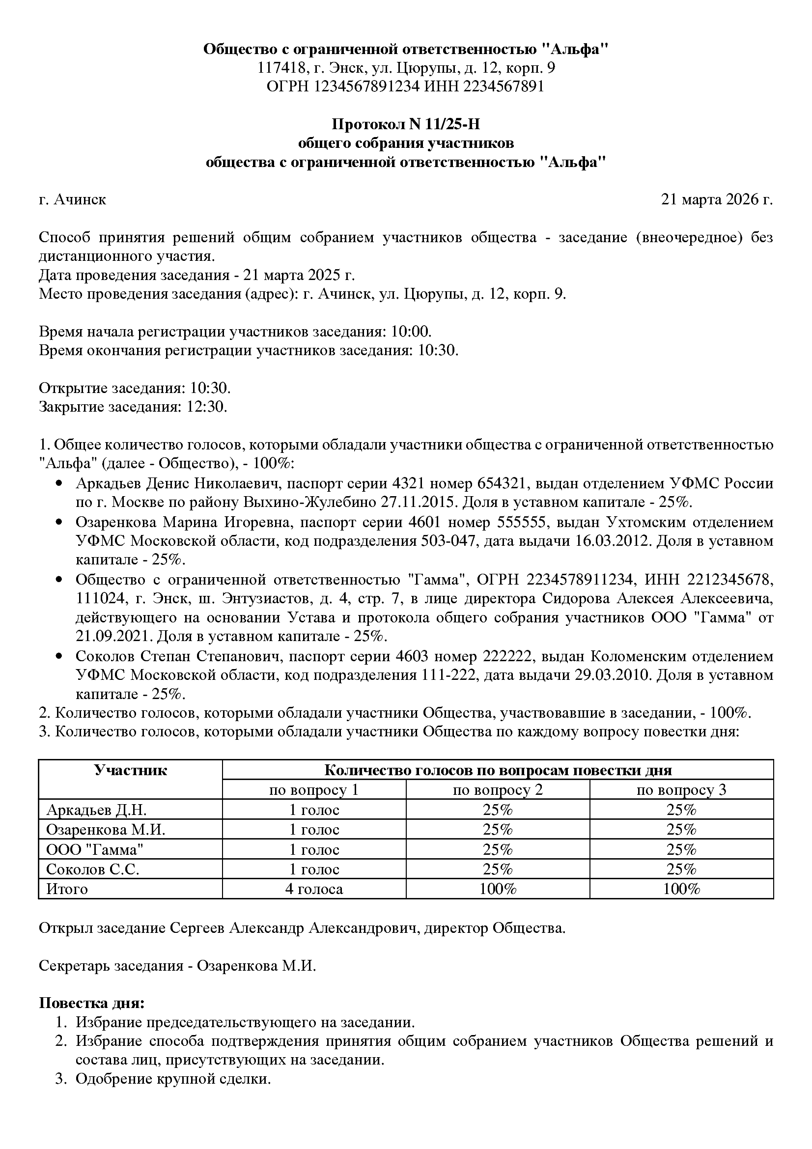 Пример 1. ООО оформляет протокол для одобрения крупной сделки по приобретению нежилого помещения.