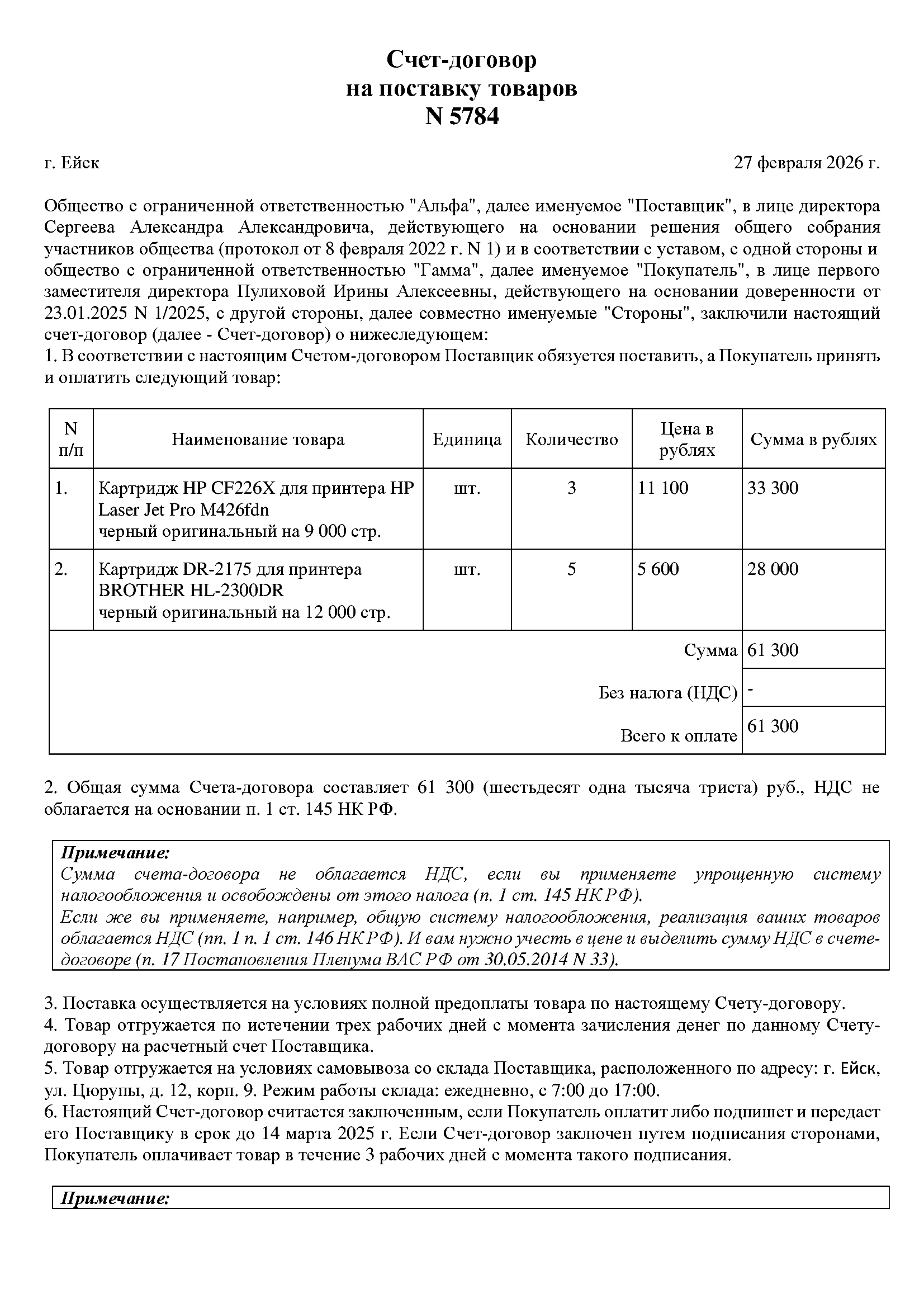 При разовых поставках или небольших сделках заключать полноценный договор бывает избыточно. В таких случаях компании используют счёт-договор — документ, который одновременно является и предложением заключить сделку, и основанием для оплаты. Если покупатель принимает условия, оплатив счёт-оферту или подписав его, договор считается заключённым в письменной форме (ст. 434 и 438 ГК РФ).