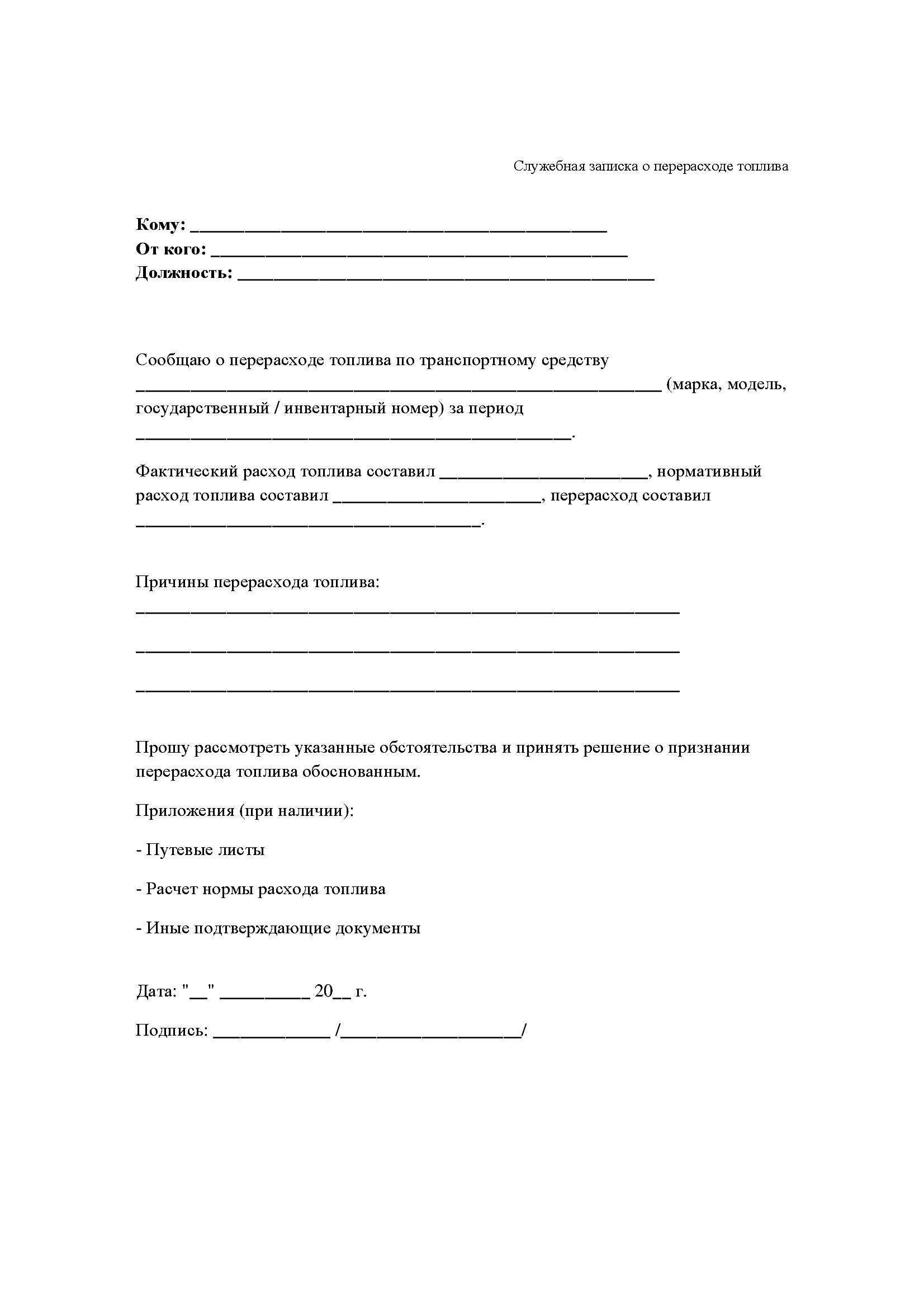 Унифицированной обязательной формы служебной записки о перерасходе топлива не установлено.