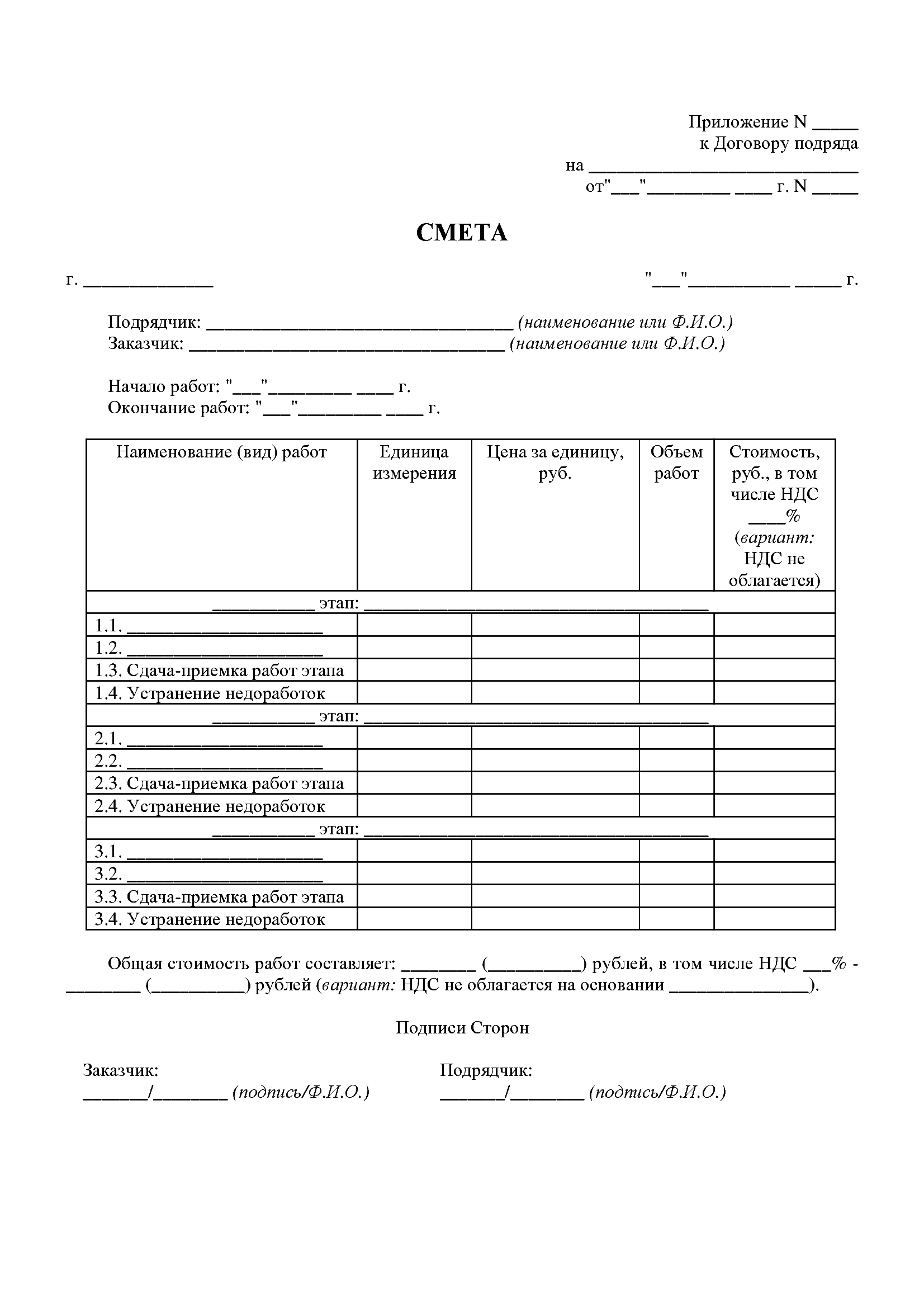 Смета может являться частью договора либо оформляться в виде отдельного приложения. В зависимости от условий договора смета используется для определения общей цены работ, этапов оплаты и порядка расчетов между сторонами.