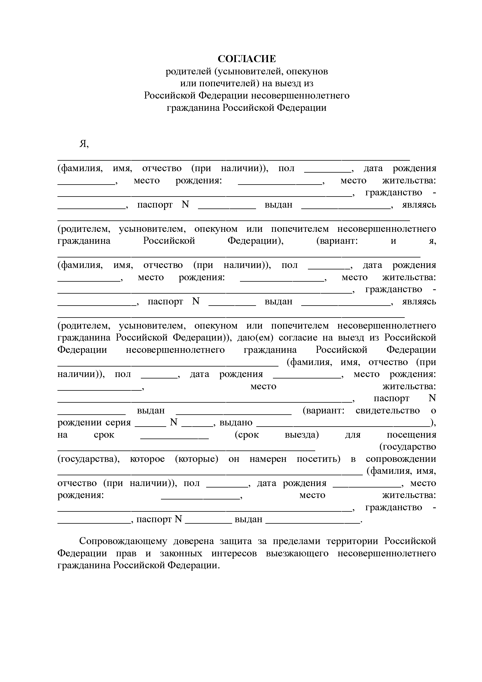 Бланк согласия на выезд ребенка за границу, как правило, включает: