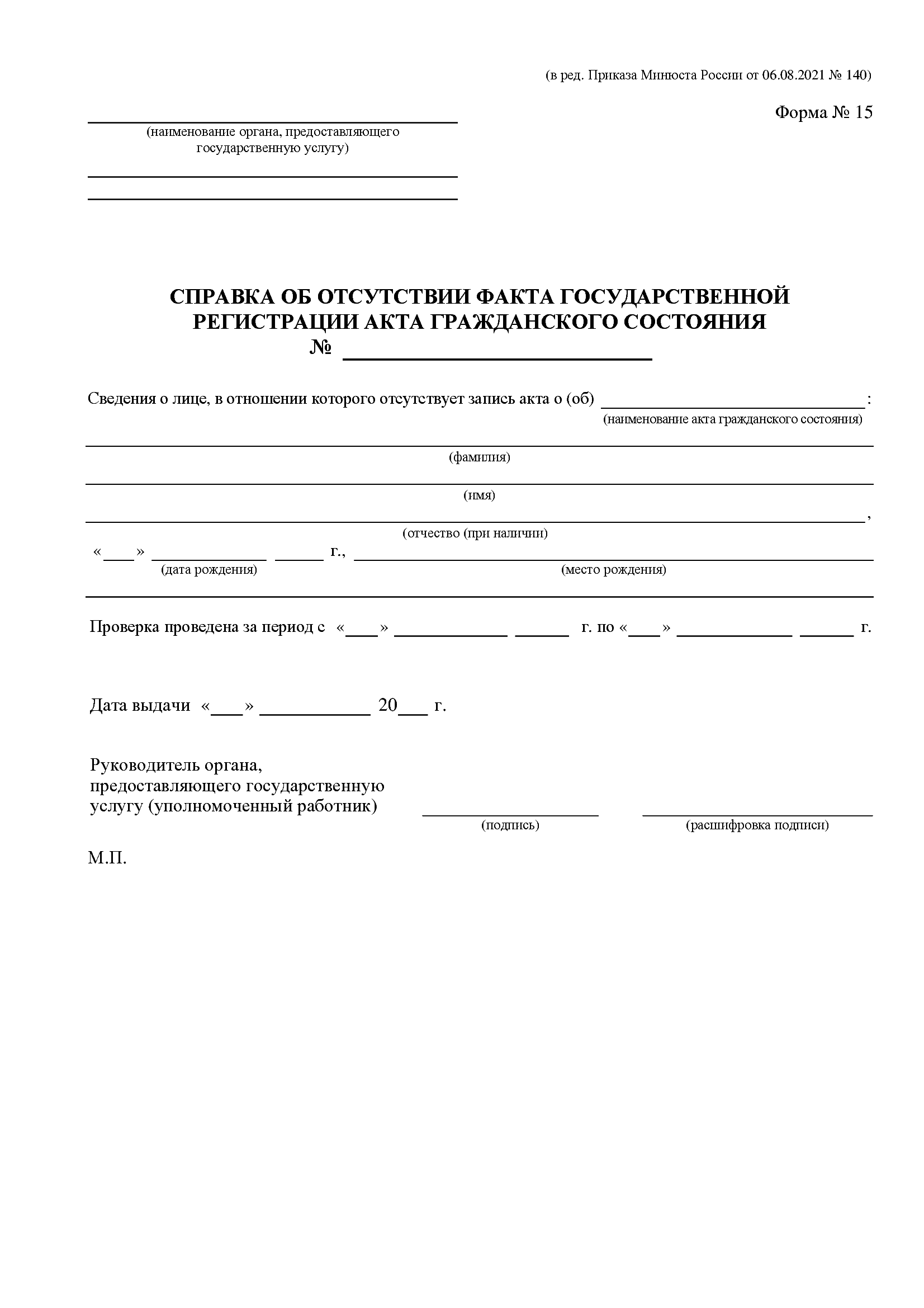 Форма № 15 — это государственная форма, применяемая органами ЗАГС для подтверждения отсутствия записи акта гражданского состояния в отношении конкретного лица. Документ официально удостоверяет, что по указанным данным в реестре актов гражданского состояния не содержится записи о рождении, браке, расторжении брака, смерти или других актах. Форма используется в административных и правовых процедурах, где требуется официальное подтверждение отсутствия записи.