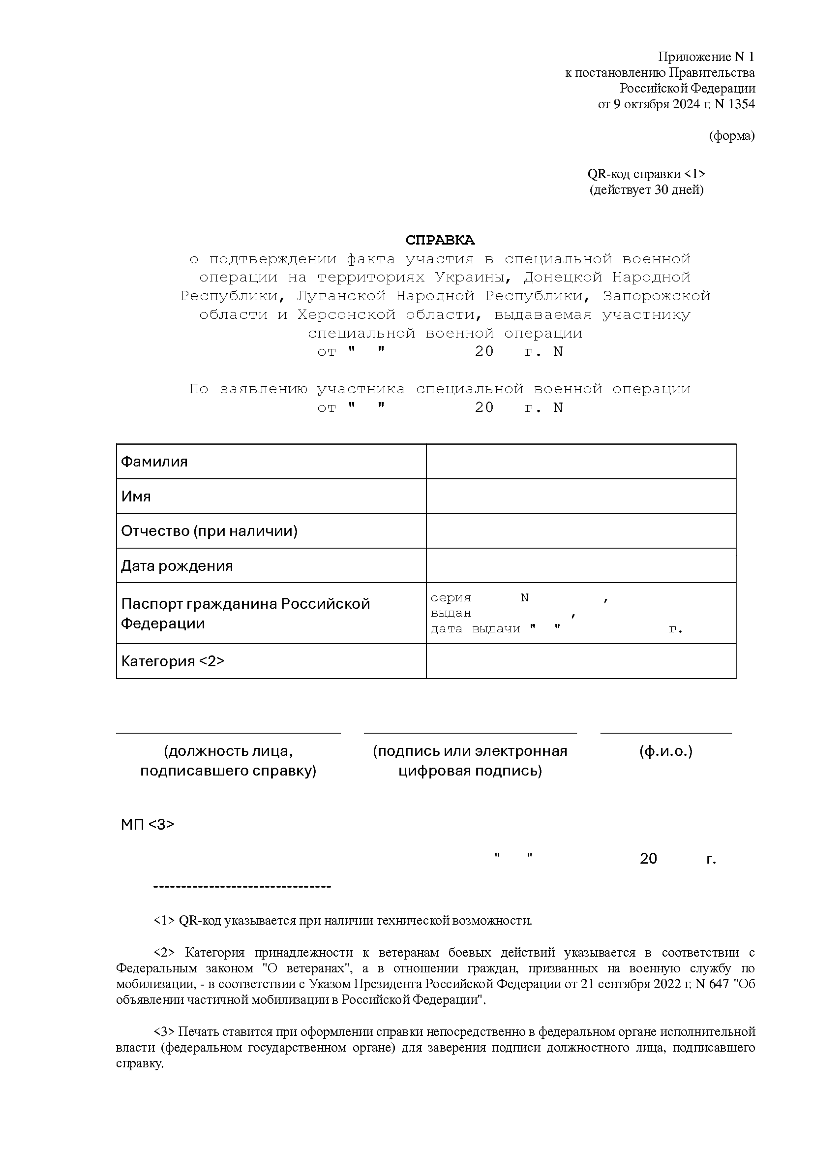 Справка о подтверждении факта участия в специальной военной операции выдается участнику специальной военной операции в соответствии с Постановлением Правительства Российской Федерации от 9 октября 2024 г. № 1354. Форма справки утверждена Приложением № 1 к указанному постановлению.