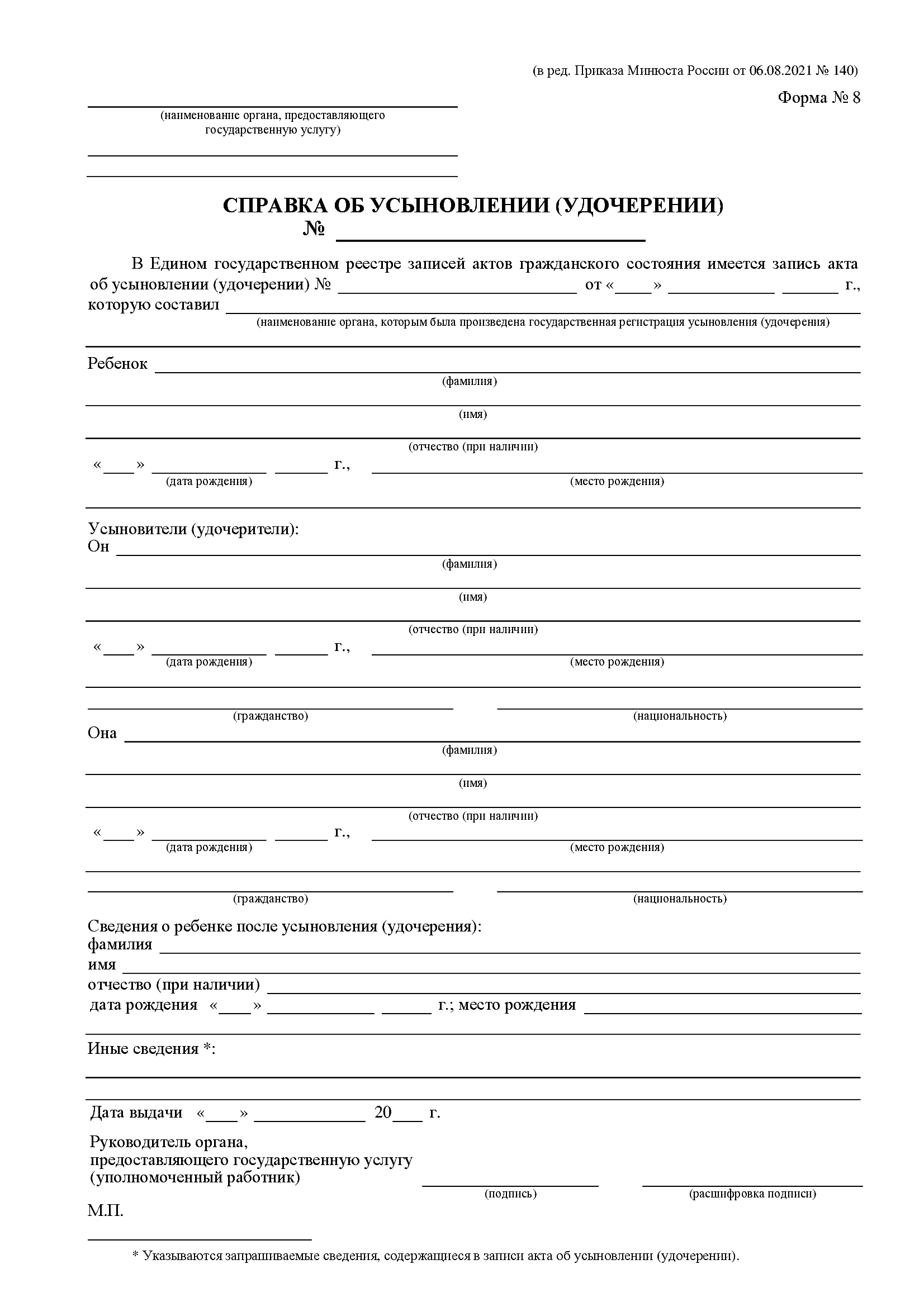 Справка об усыновлении (удочерении). Форма № 8