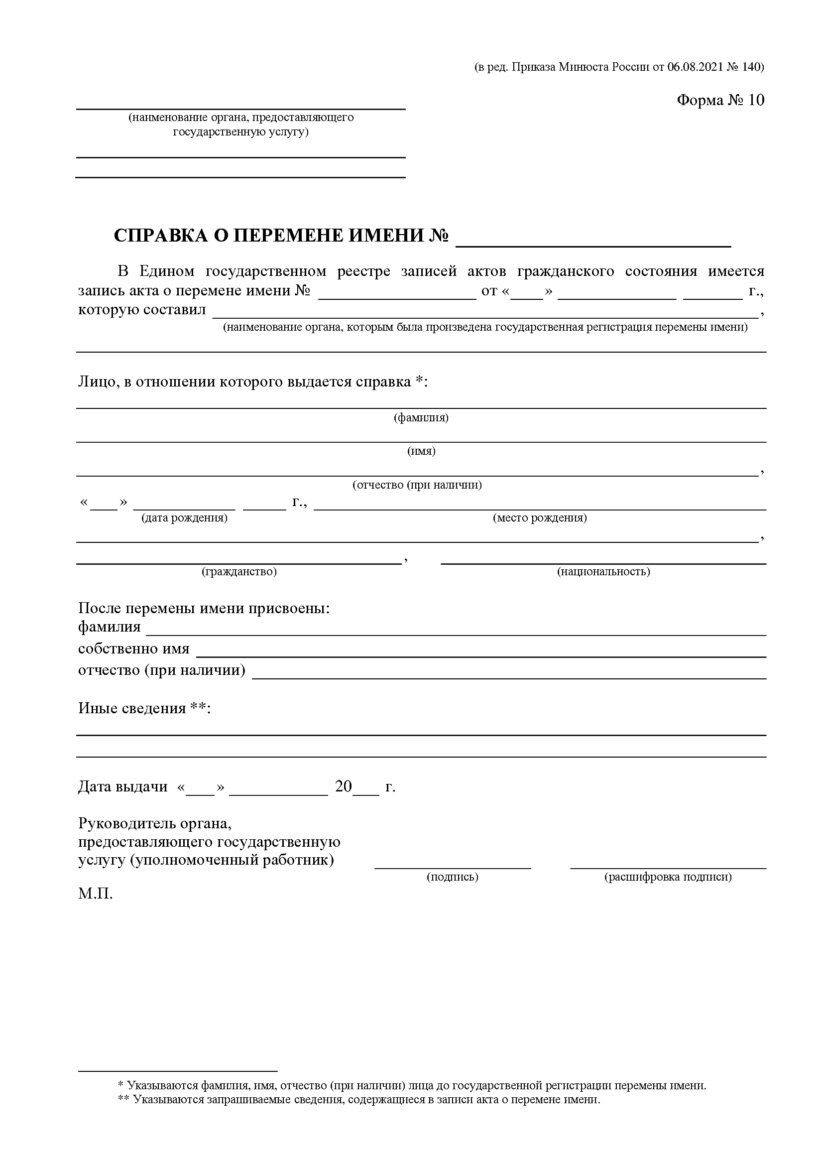 Справка о перемене имени (Форма № 10) — это официальная государственная справка, выдаваемая органом, предоставляющим государственную услугу в сфере регистрации актов гражданского состояния. Документ подтверждает факт внесения записи о перемене имени в Единый государственный реестр записей актов гражданского состояния (ЕГР ЗАГС) и используется в административных, правовых и организационных процедурах.