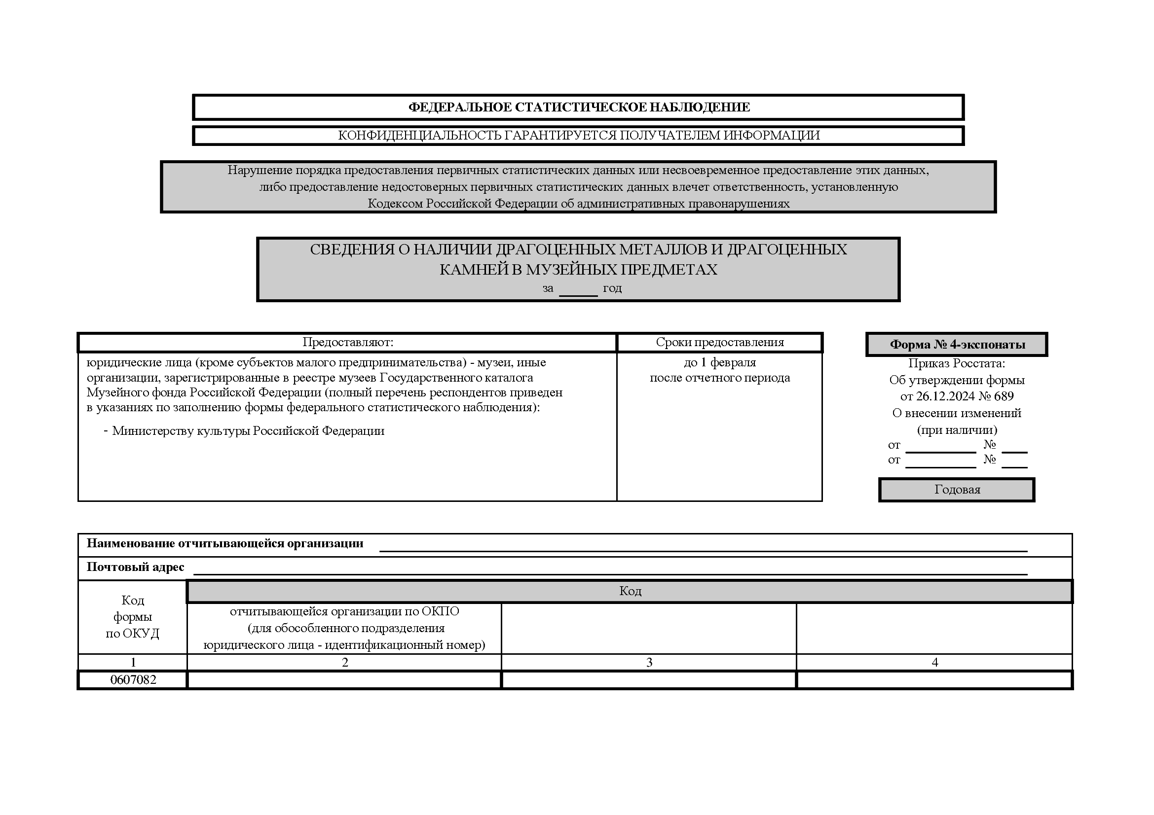 Форма федерального статистического наблюдения N 4-экспонаты «Сведения о наличии драгоценных металлов и драгоценных камней в музейных предметах», код по ОКУД 0607082, годовая, утверждена приказом Росстата от 26.12.2024 N 689.