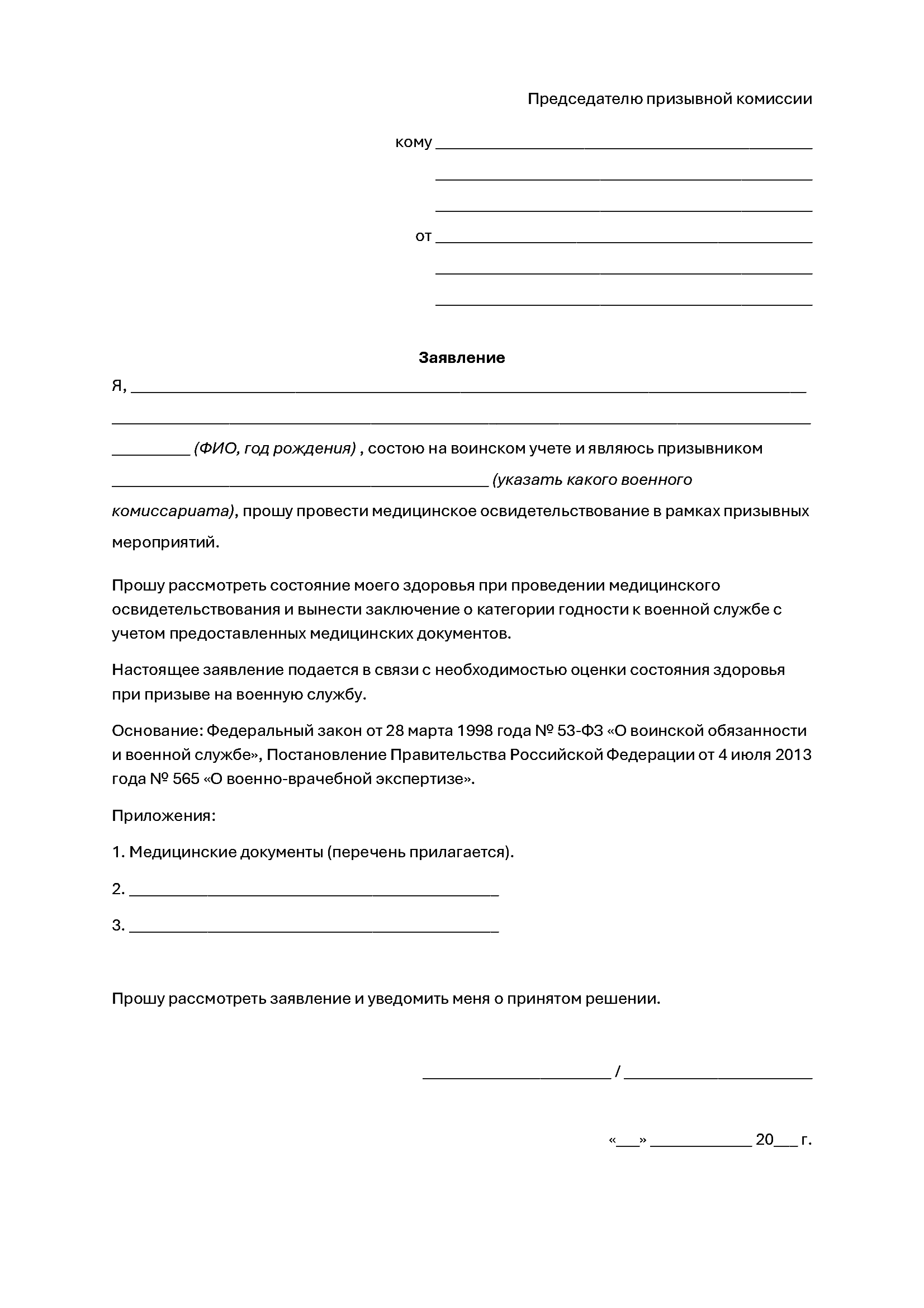 Заявление на медицинское освидетельствование при призыве — это письменное обращение призывника в призывную комиссию с просьбой провести или повторно провести медицинское освидетельствование в рамках призыва в армию.