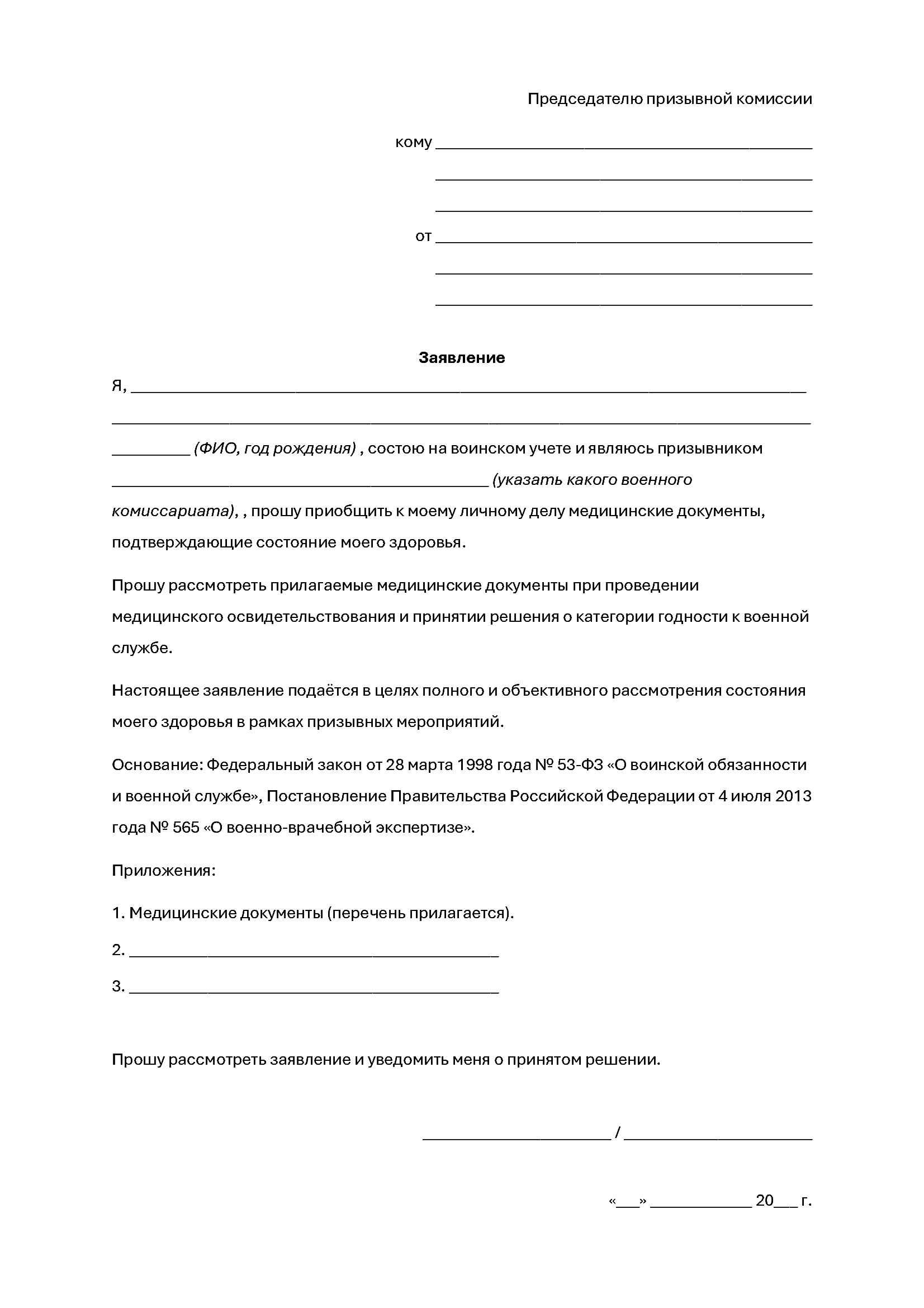 Заявление о приобщении медицинских документов оформляется в письменной форме и служит способом зафиксировать требование призывника об обязательном рассмотрении представленных медицинских сведений.