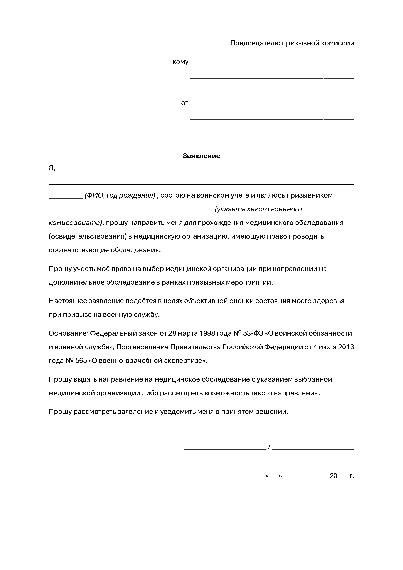 Заявление оформляется в письменной форме и позволяет призывнику заявить о своём праве на выбор медицинской организации при направлении на обследование.