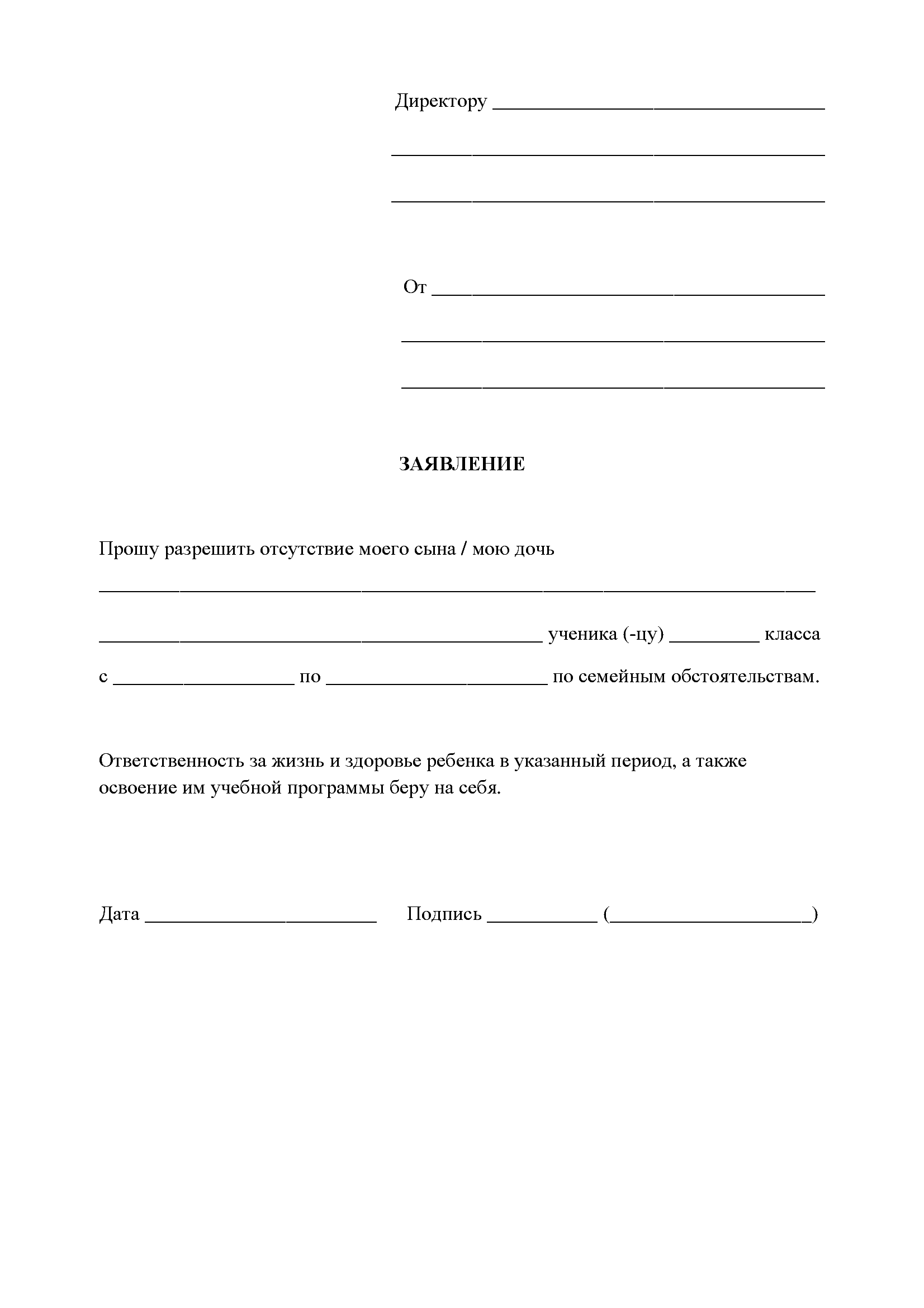- «Прошу разрешить отсутствие моего ребёнка … в период с … по …»;