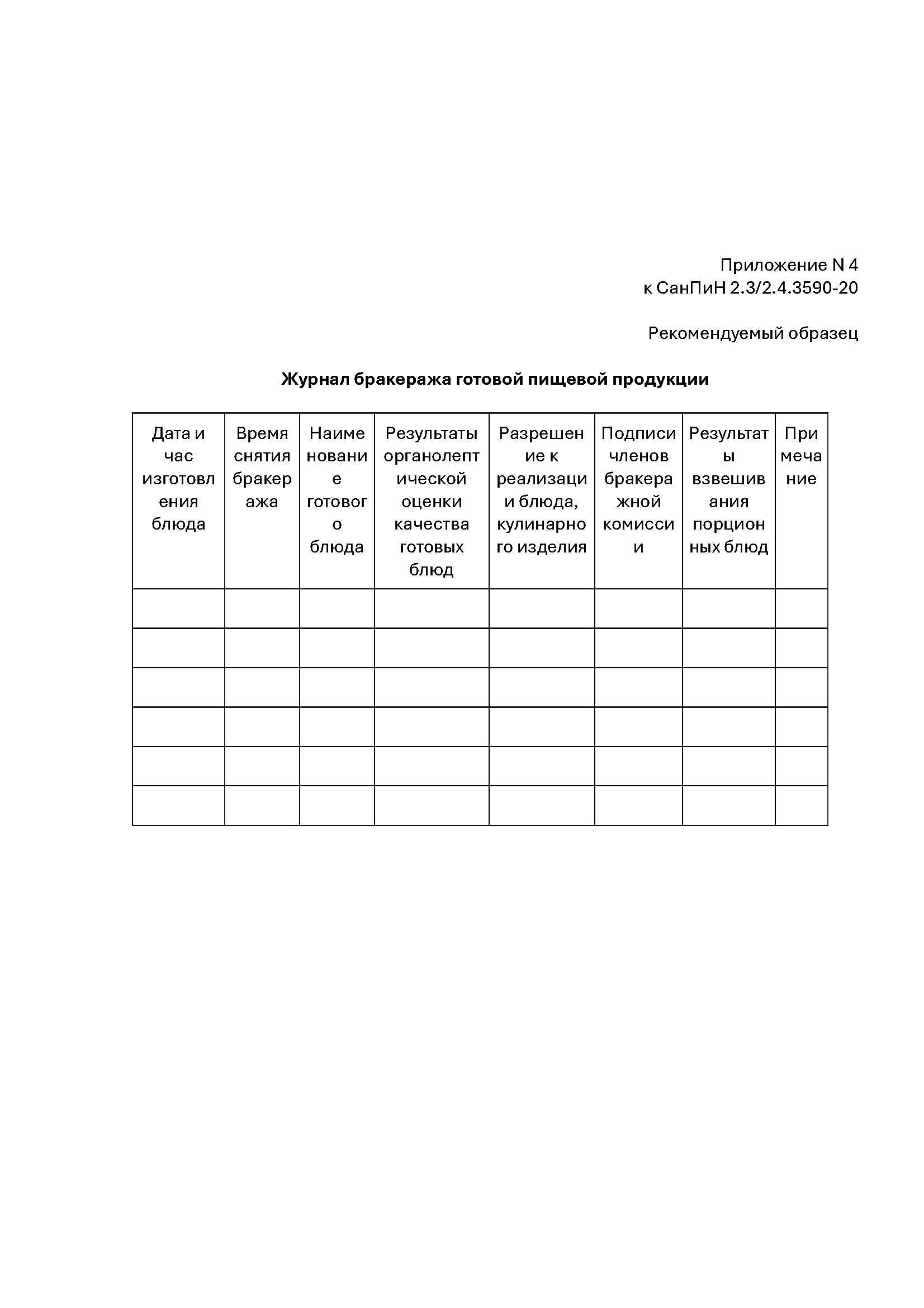 Рекомендуемая форма журнала бракеража приведена в приложениях к указанным санитарным правилам.