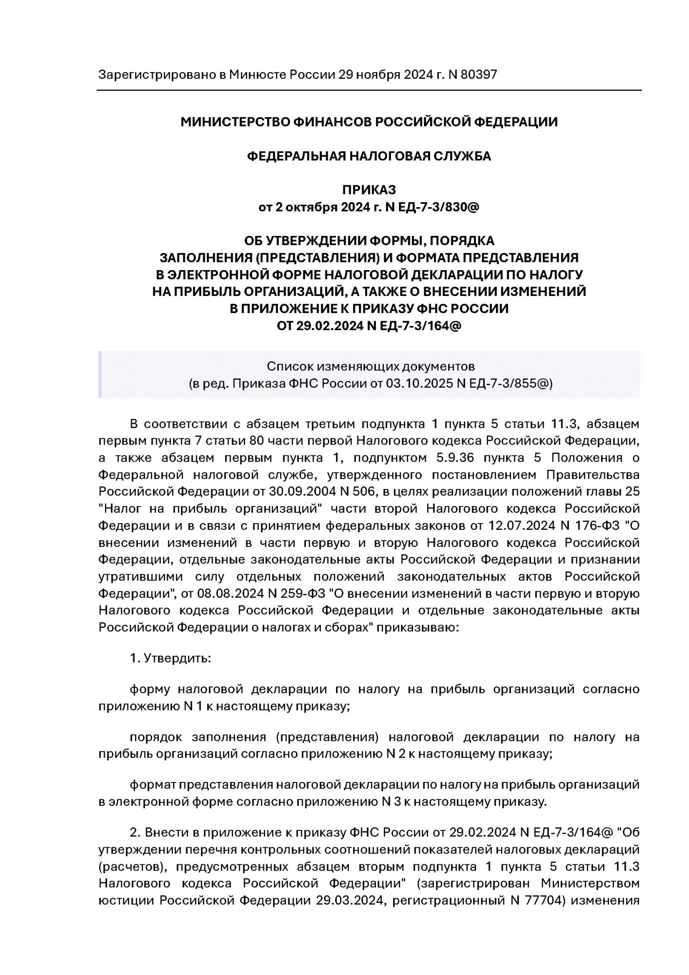 Приказ ФНС России от 02.10.2024 N ЕД-7-3/830@ (ред. от 03.10.2025). Об утверждении формы, порядка заполнения (представления) и формата представления в электронной форме налоговой декларации по налогу на прибыль организаций, а также о внесении изменений в приложение к приказу ФНС России от 29.02.2024 N ЕД-7-3/164@.
