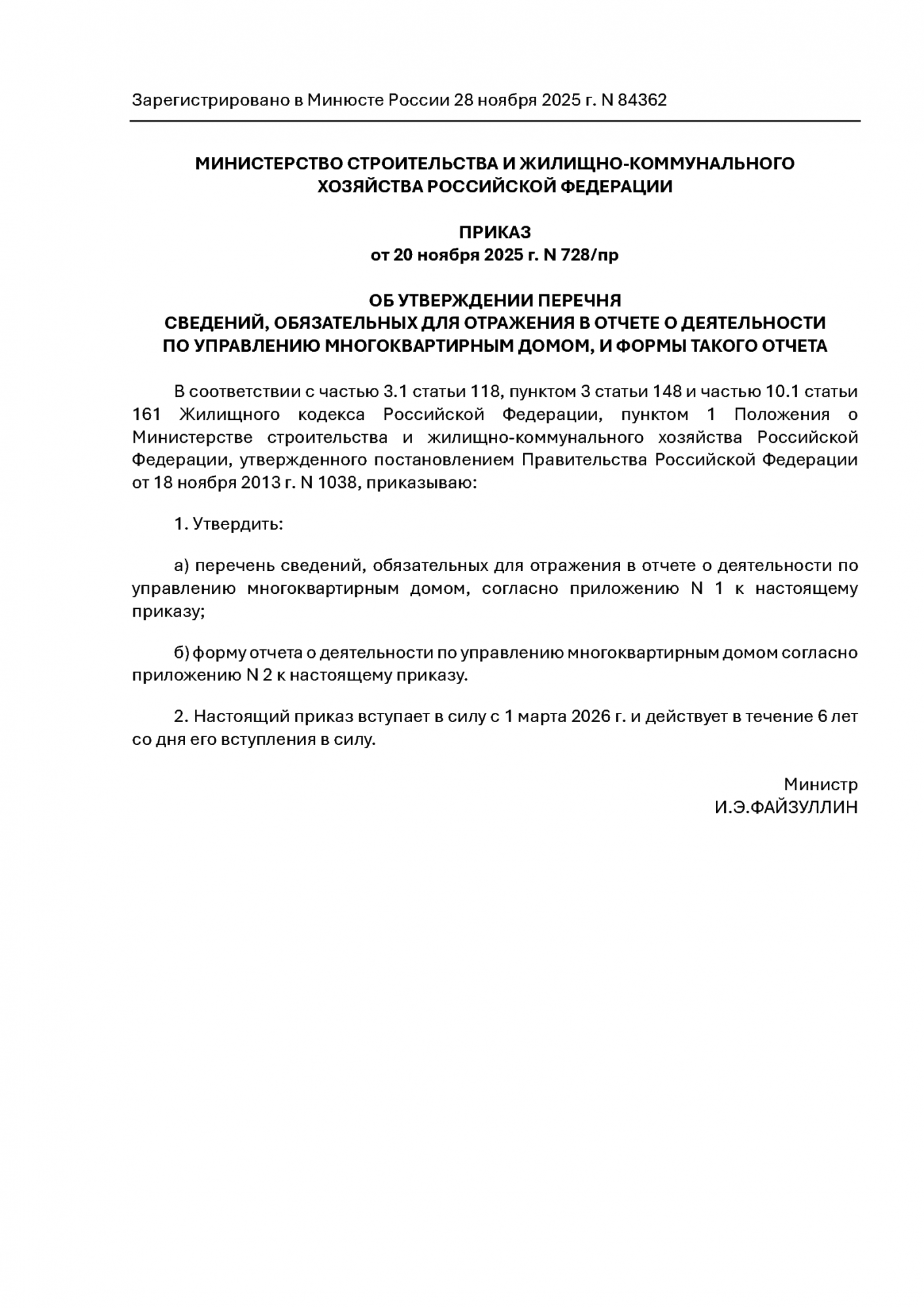 Приказ Минстроя России от 20.11.2025 N 728/пр "Об утверждении перечня сведений, обязательных для отражения в отчете о деятельности по управлению многоквартирным домом, и формы такого отчета".